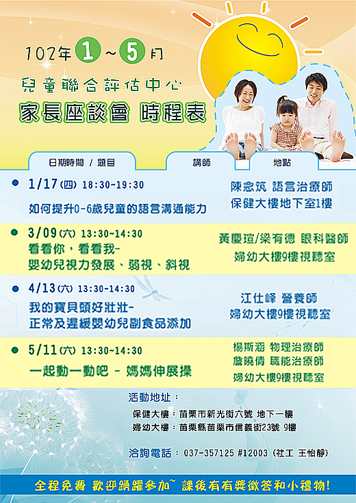 主辦單位: 主持人:眼科黃慶瑄/梁有德醫師 資格: 人數:不限 費用:免費 供餐:無 連絡: 報名期限: 附件:無 備註:1.參加課程者,贈送精美禮品 2.本活動和親子教室共同 ej/4w舉辦