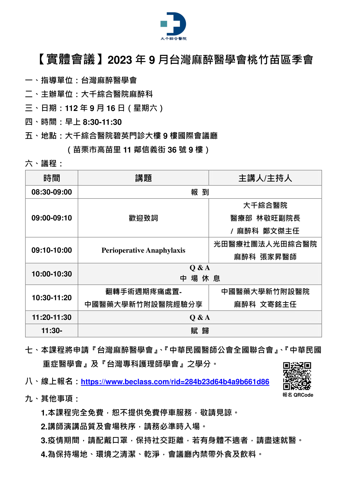 09/16(六)---2023年9月台灣麻醉醫學會桃竹苗區季會(大千綜合醫院/台灣麻醉醫學會)