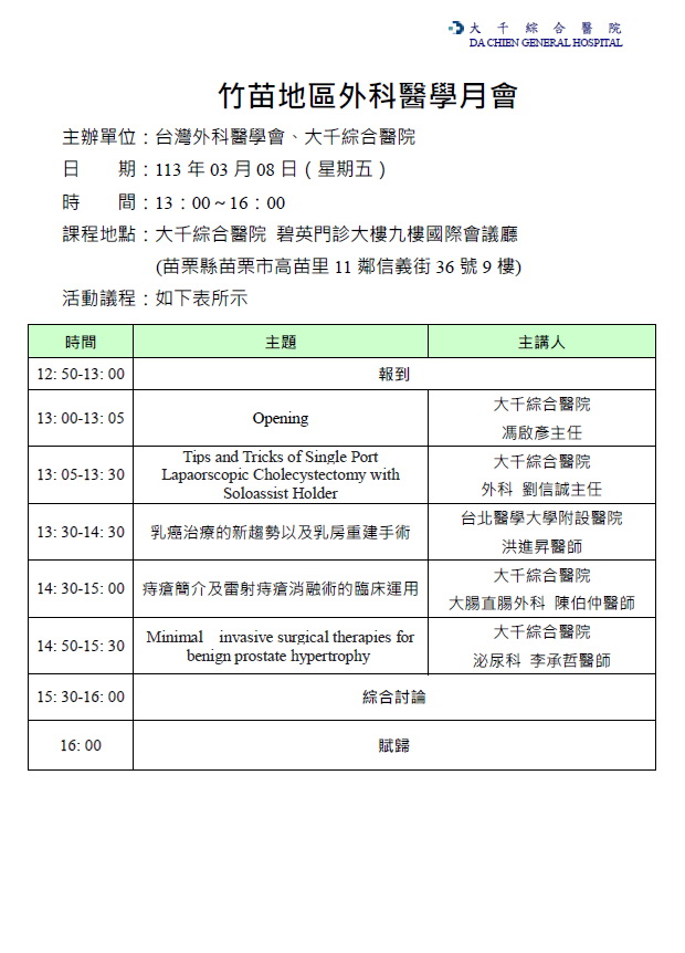 | 課程地點: | 大千綜合醫院碧英門診大樓9樓國際會議廳(地址:苗栗市高苗里11鄰信義街36號9樓) |