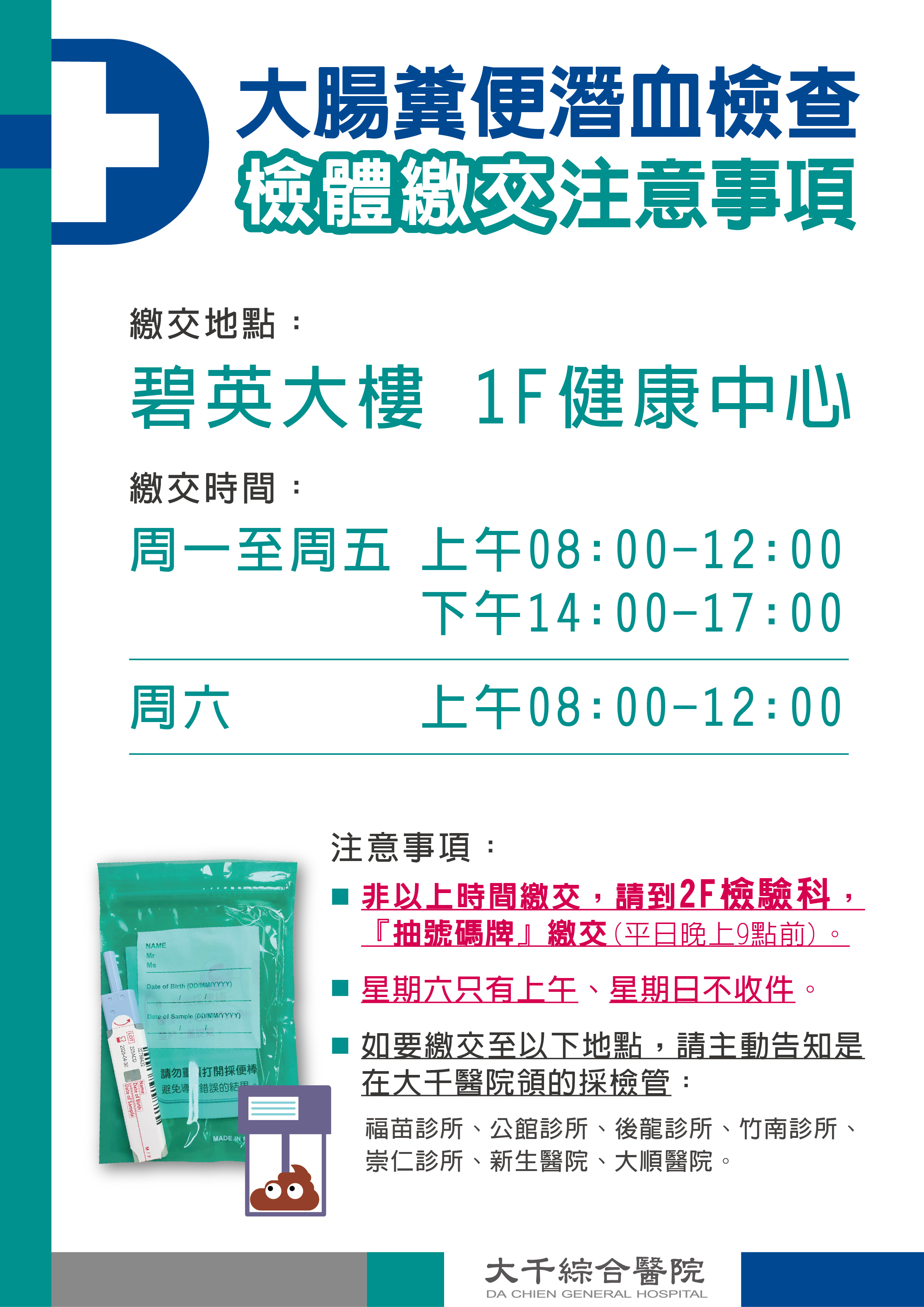 除了繳交至大千醫院外,我們還提供體系院區收件,便利苗栗縣民,落實完成篩檢!!!