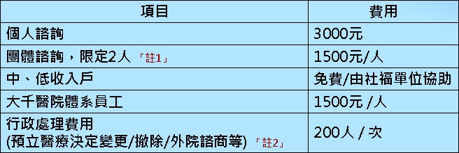 - 費用包含掛號費,預立醫療諮商費(ACP)及預立醫療決定書(AD)上傳費用。