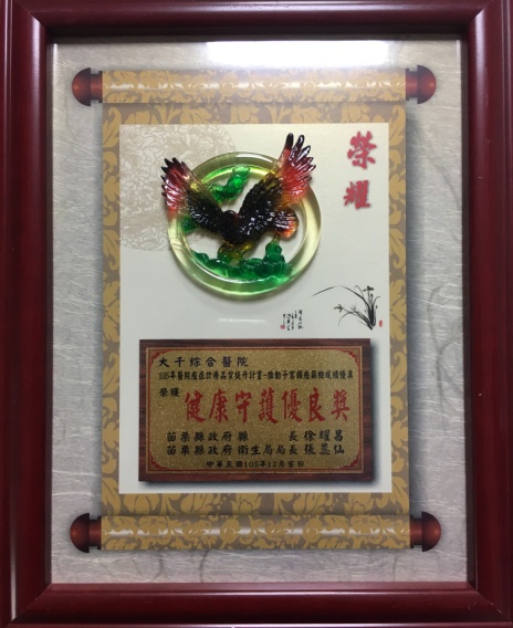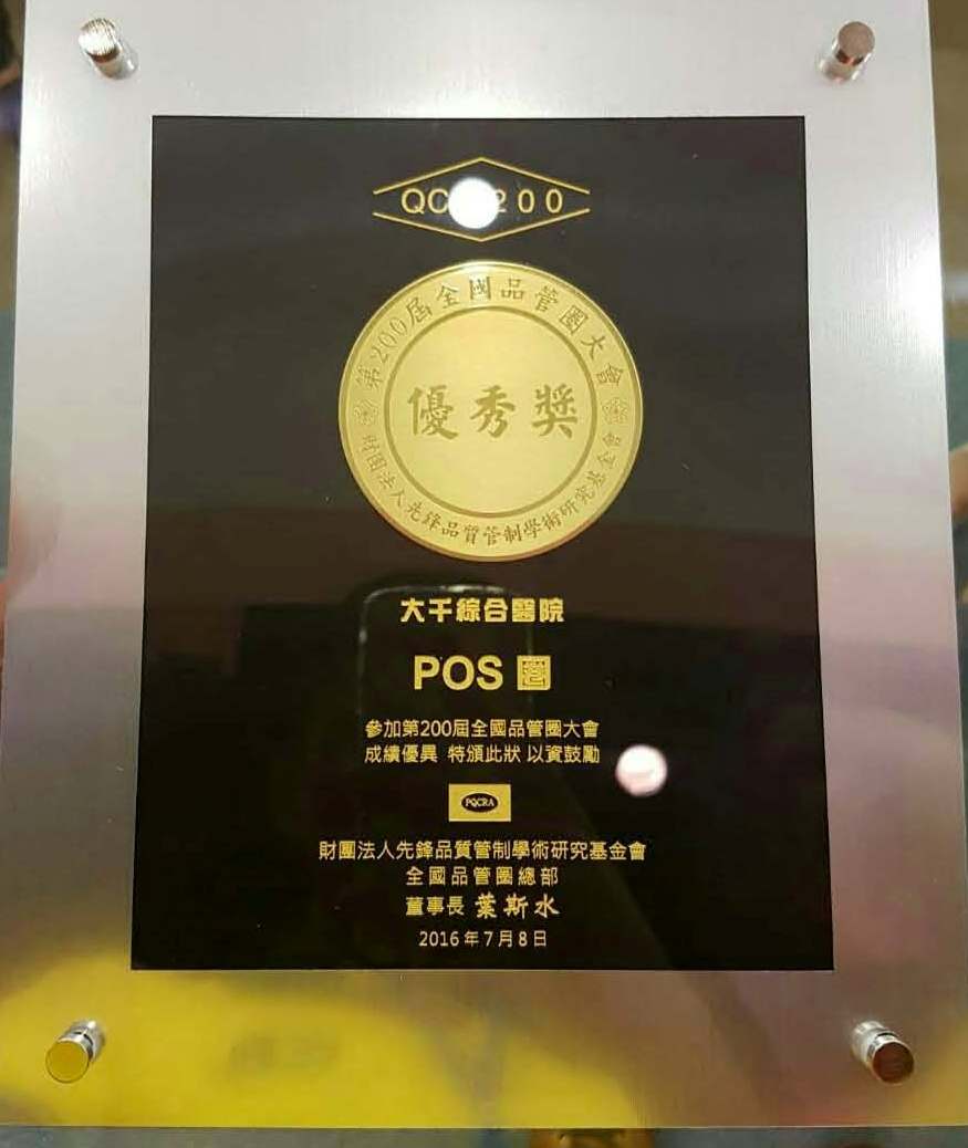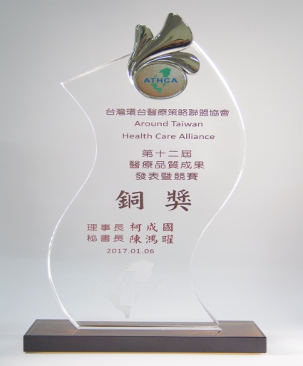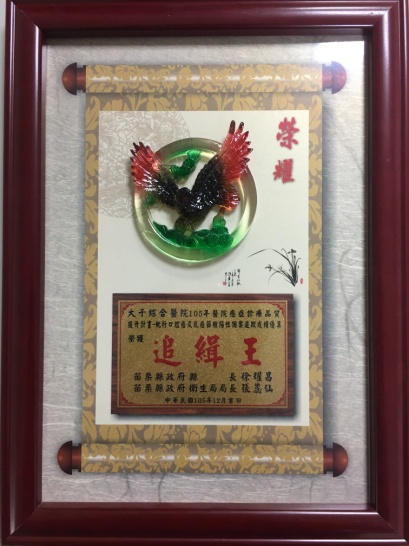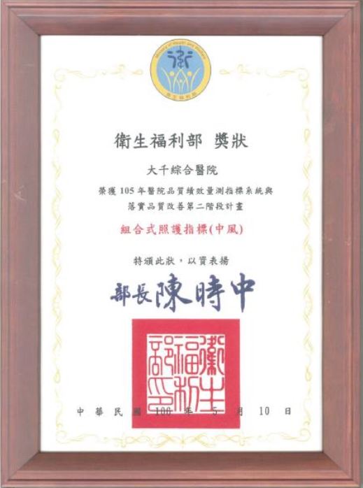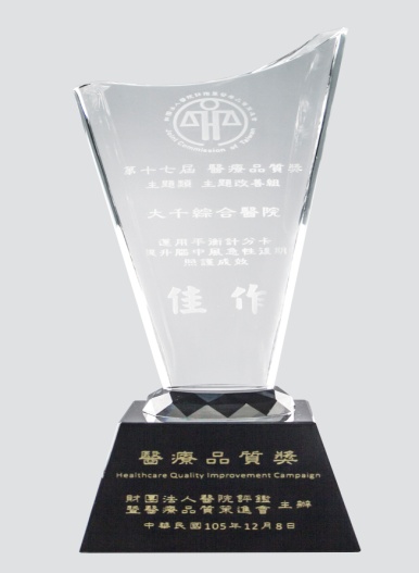 105執行口腔及乳攝篩檢陽性個案追蹤成績優異-追緝王 105第29屆全國團結圈活動競賽-ABO掌心圈-銅塔獎 105第29屆全國團結圈活動競賽-針安圈-金塔獎 105第200屆全國品管圈大會-POS圈-優秀獎 105衛福部醫院品質績效-組合式照護 105環台第十二屆醫療品質成果發表競賽-銅獎 105醫院癌症診療計畫-推動子宮頸癌成績優異-健康守護優良獎 105醫療品質獎HQIC佳作