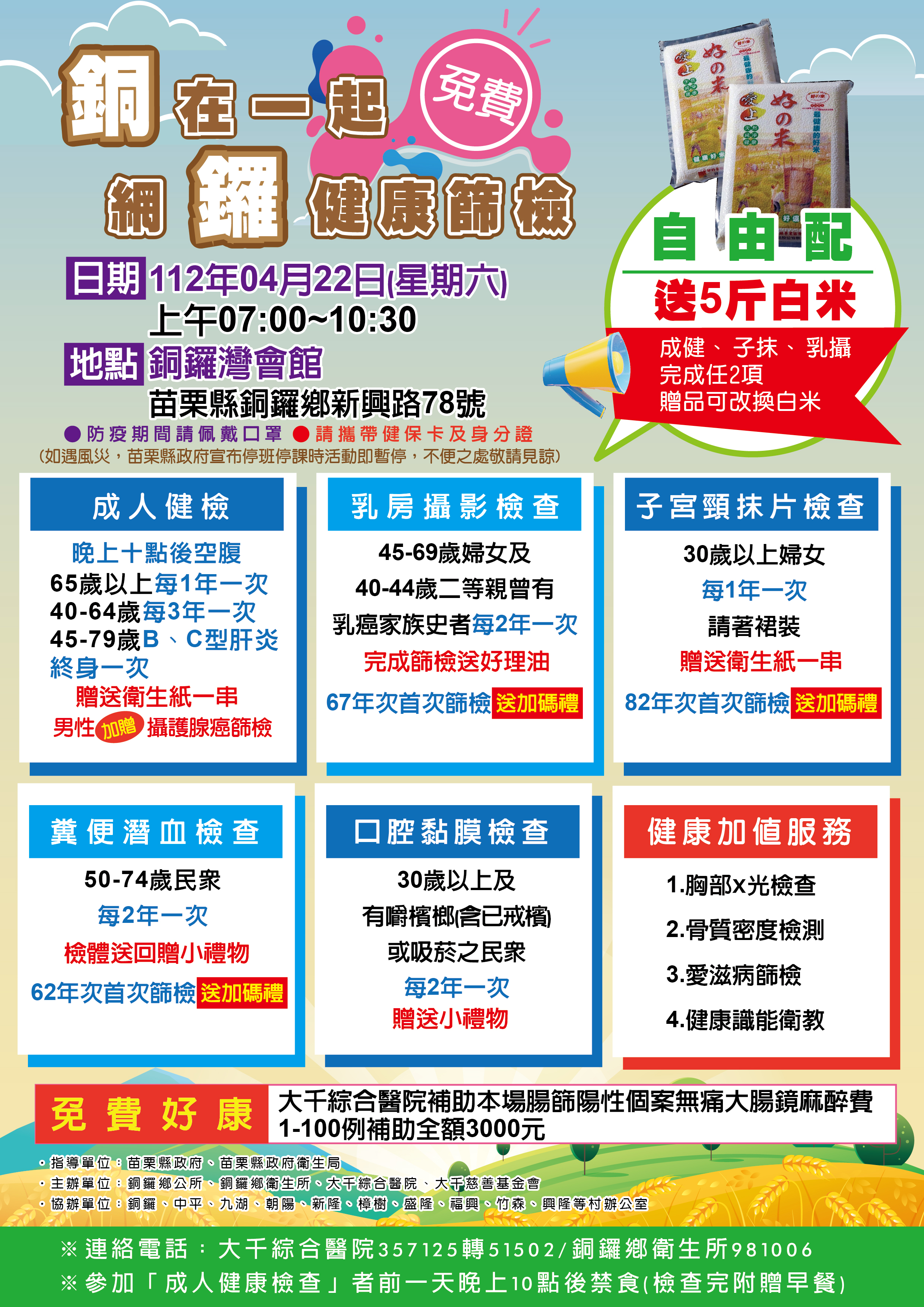社區健康篩檢 - 112/04/22(六) ╴銅鑼鄉整合性篩檢活動