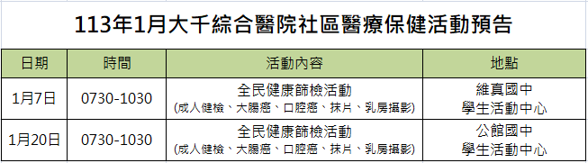 活動預告 - 113年1月整合性篩檢活動預告報你知