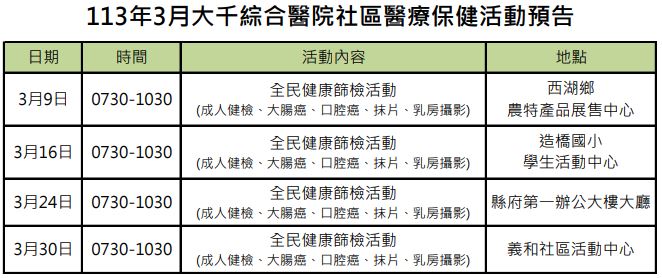 活動預告 - 113年3月整合性篩檢活動預告報你知