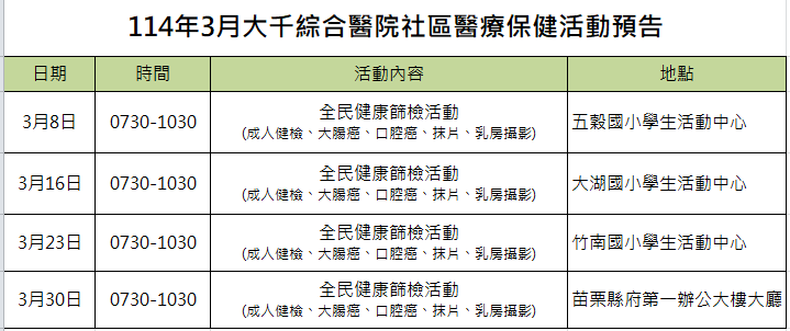 活動預告 - 114年3月整合性篩檢活動預告報你知