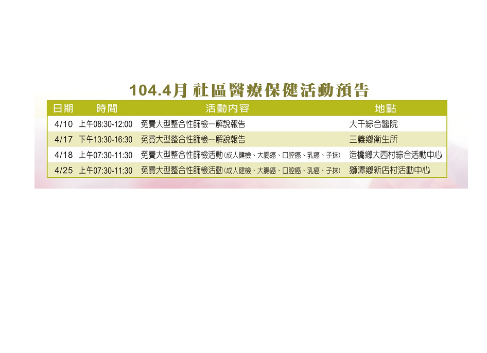 活動預告 - 10404 社區醫療保健活動預告