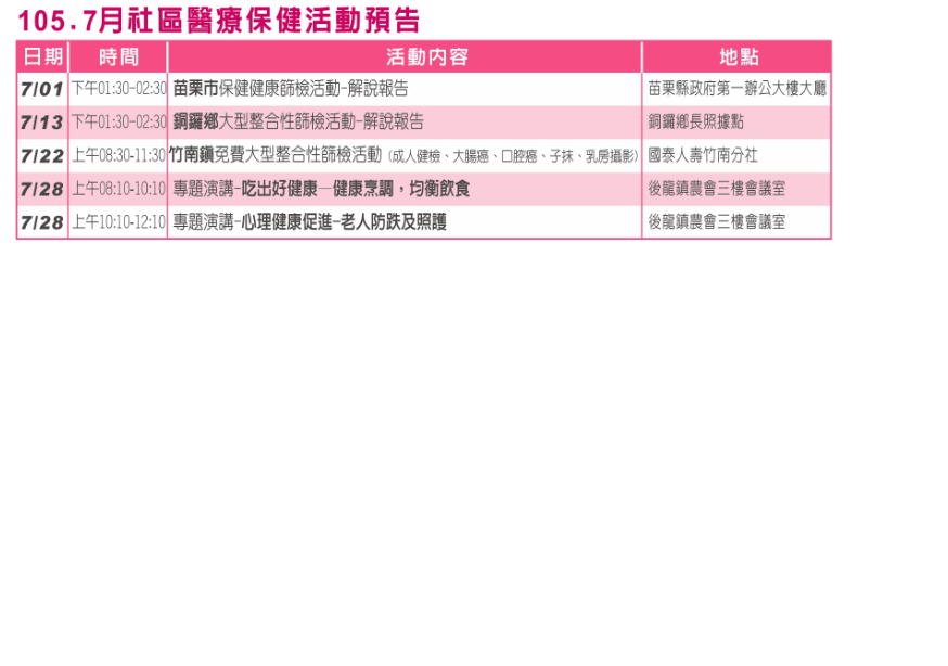 活動預告 - 10507 社區醫療保健活動預告