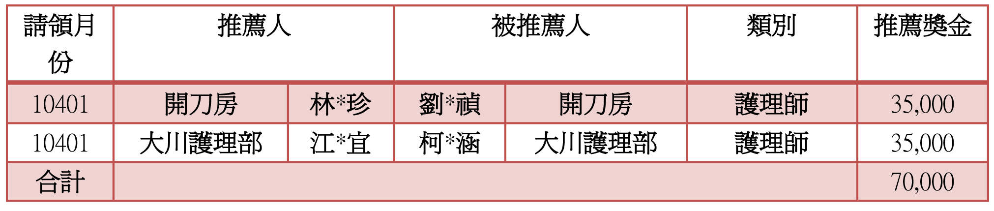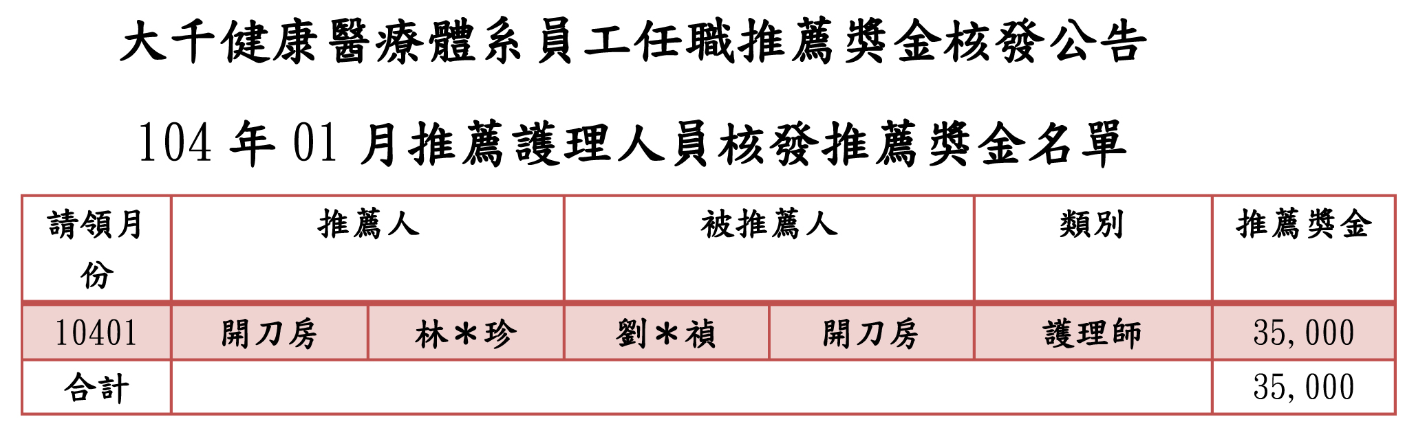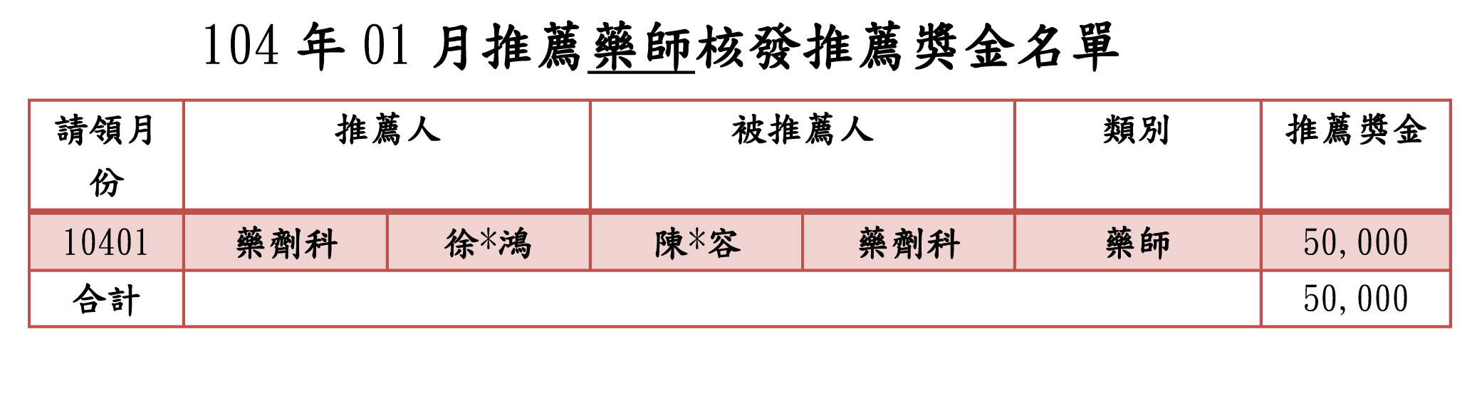 104年01月推薦藥師及護理人員核發推薦獎金名單