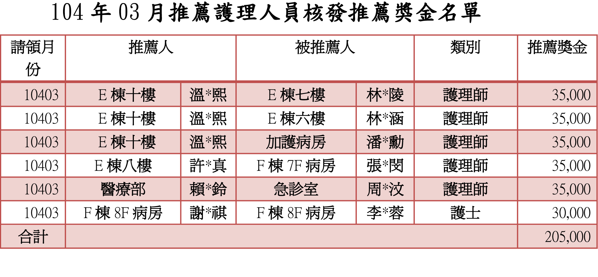 {公告}104年3月推薦護理人員核發推薦獎金名單