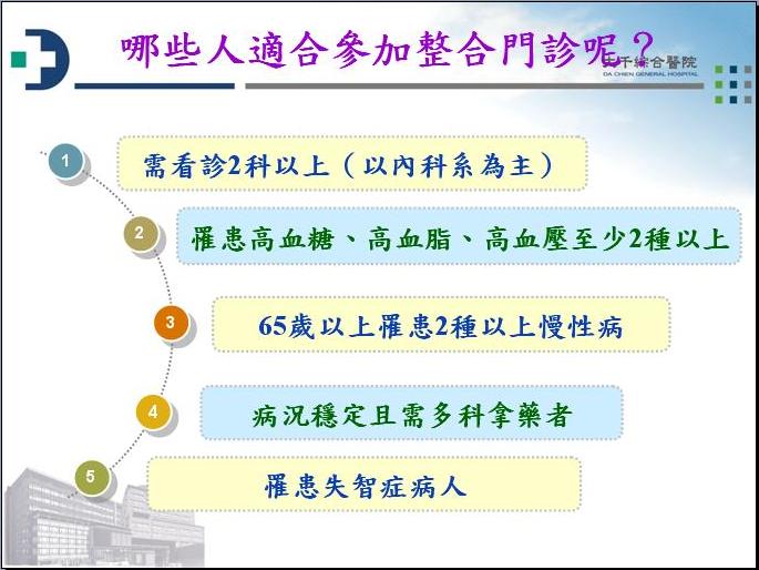 大千健康醫療體系徐千剛總裁表示,整合照護門診為跨科別及團隊的醫療照護,結合醫師、護理師、藥師、營養師及個管師的專業,提供民眾多元化及連續性的整合照護。只要經過醫師評估為適用整合照護門診的患者,未來看診時即可選擇有整合照護的門診時段就醫,一次看診能享多科服務,除了省下等候時間及多科掛號費用,還能確保用藥安全,提升民眾就醫品質。另外,陳進堂 執行長表示,如果患者因就醫時間或習慣無法選擇整合照護門診的時段,可於就醫時主動向醫師提出,亦能由醫師端協助做到整合照護。