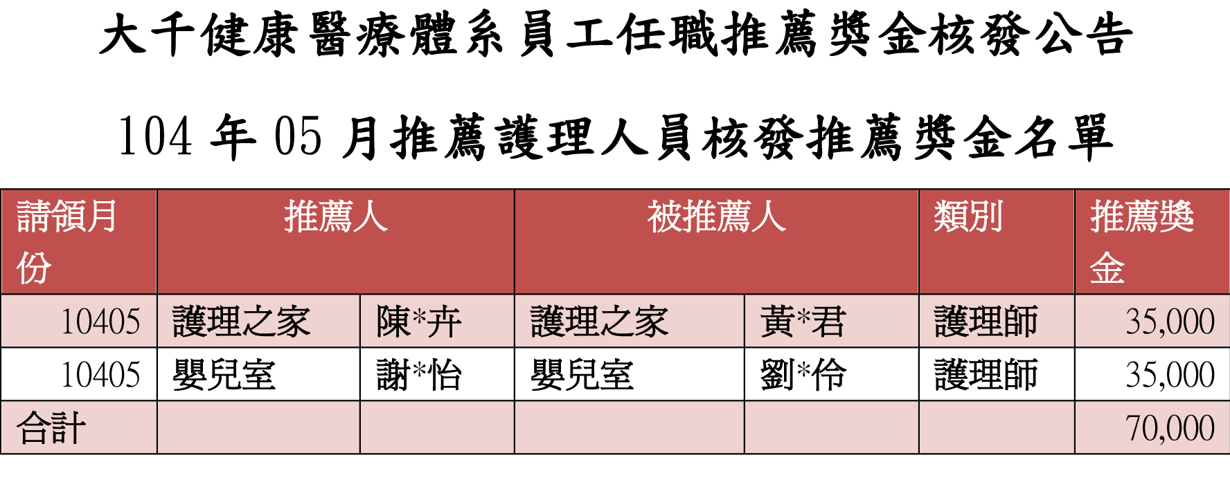 {公告}104年5月推薦護理人員核發推薦獎金名單