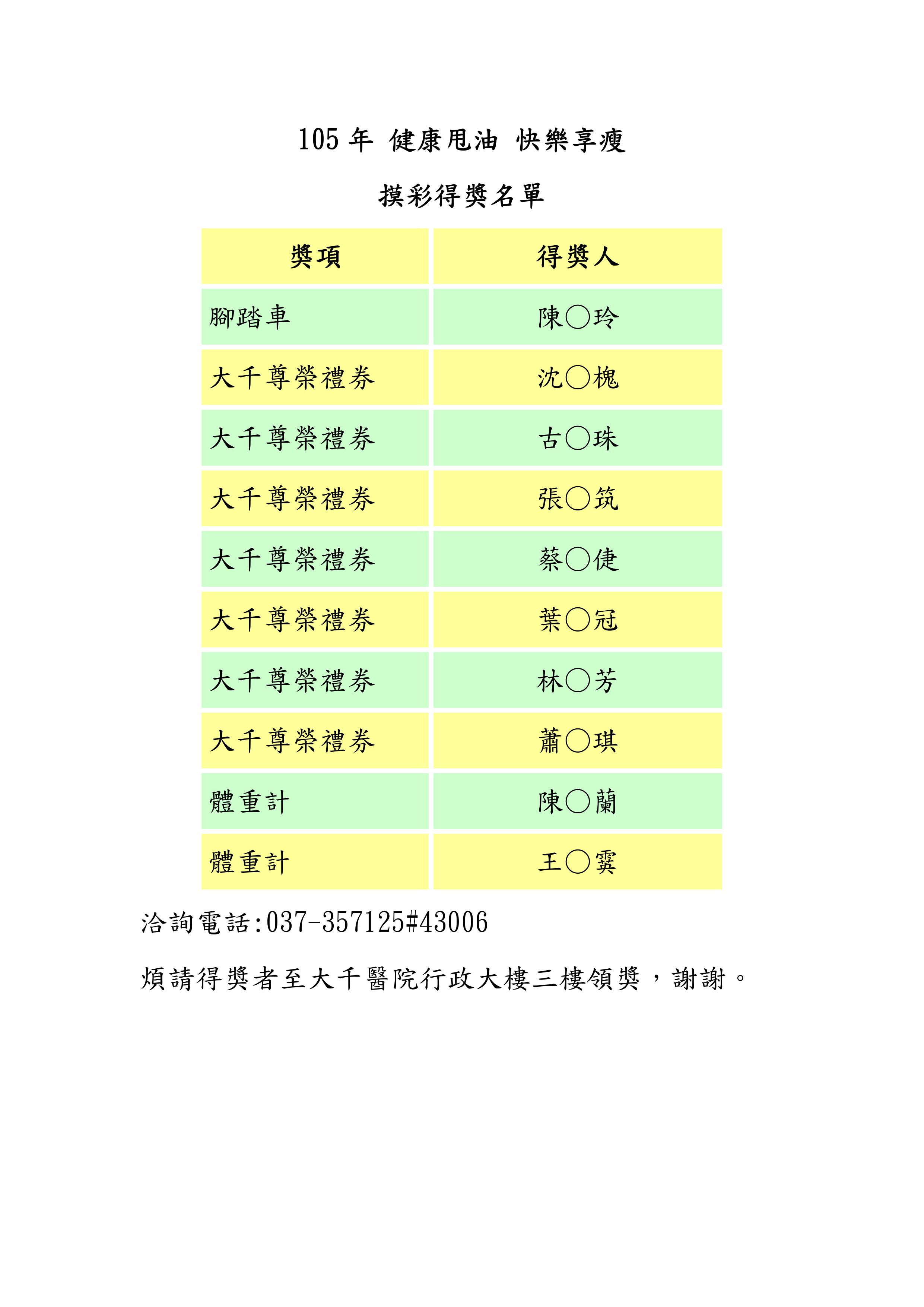 105年健康甩油 快樂享瘦~減重比賽成績&抽獎名單公告