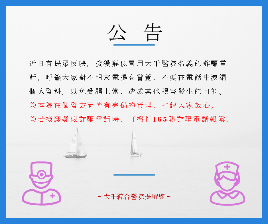 近日有民眾接獲疑似冒用本院名義的電話,敬請提高警覺,避免電話詐騙!
