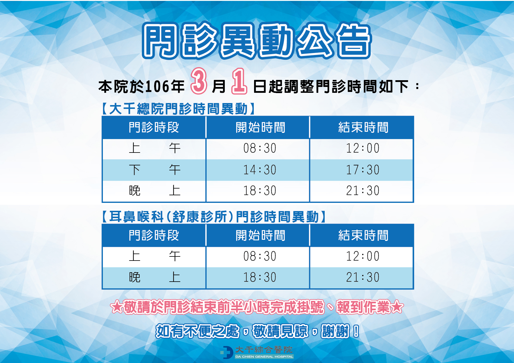 《門診異動公告》本院自3月1日起調整門診時間,請於門診結束前半小時完成掛號、報到作業,謝謝