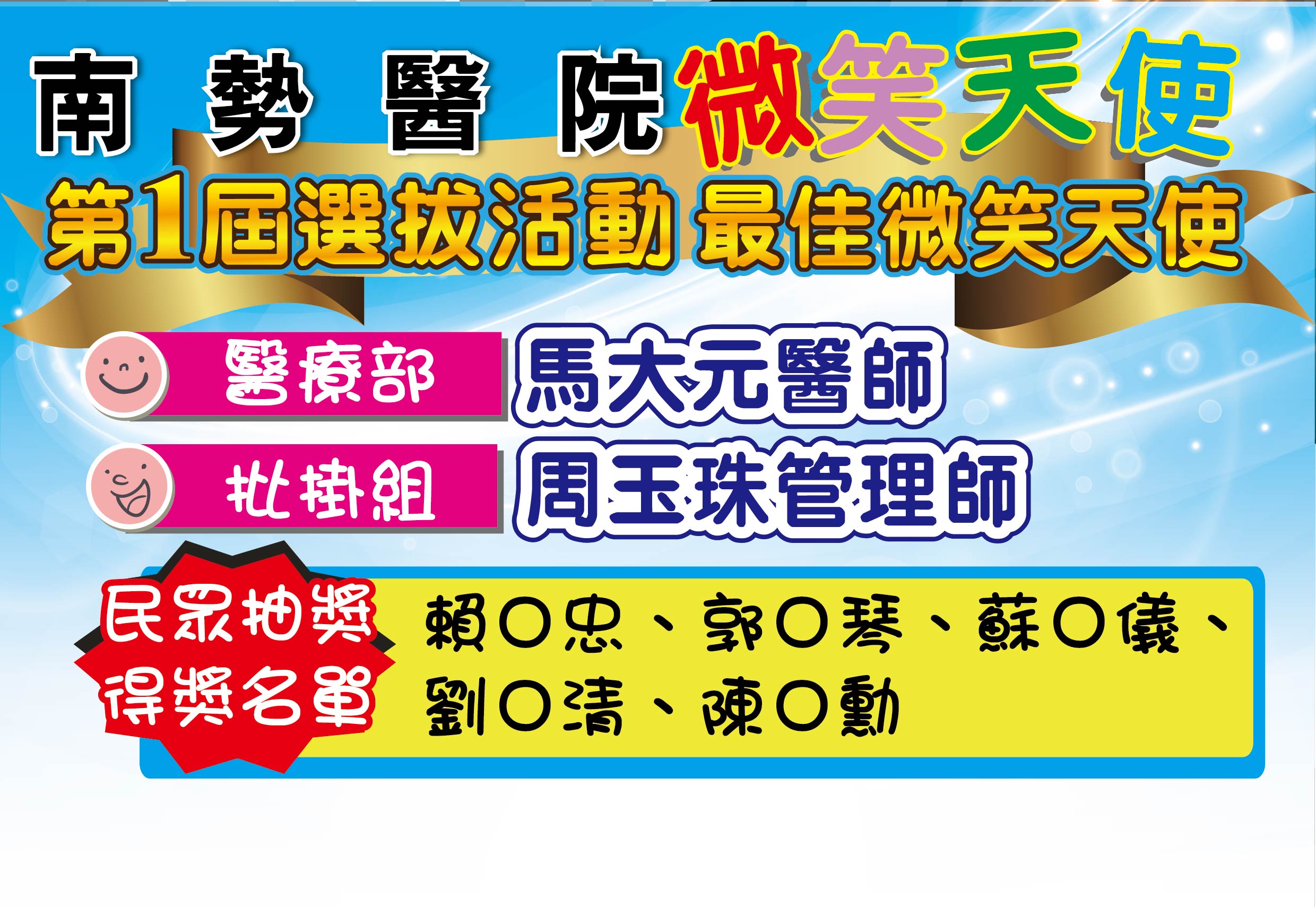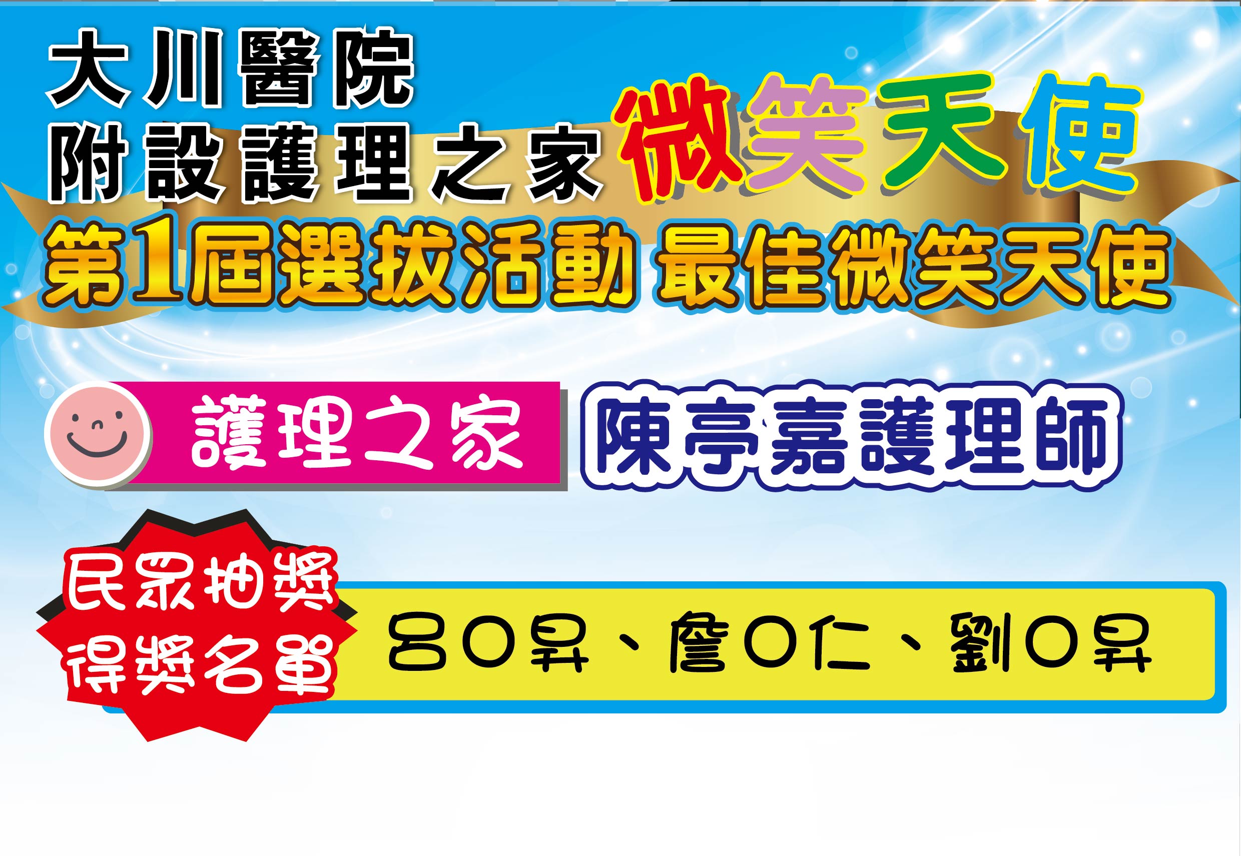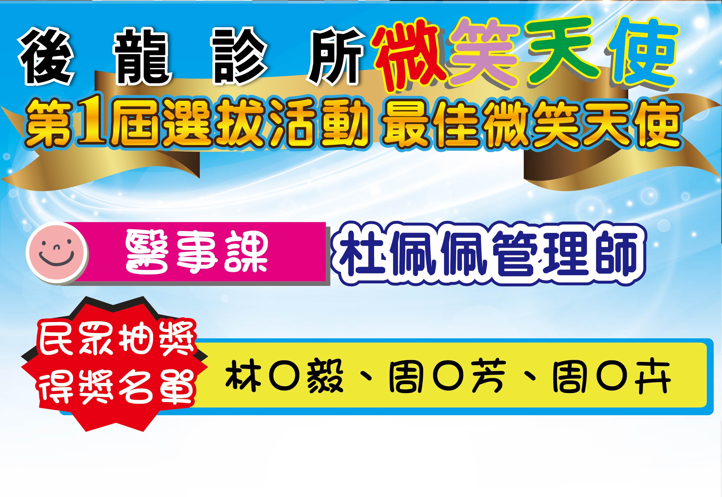 感謝活動期間給予我們支持、鼓勵的民眾 恭喜所有被選拔的微笑天使及幸運獲獎的民眾。