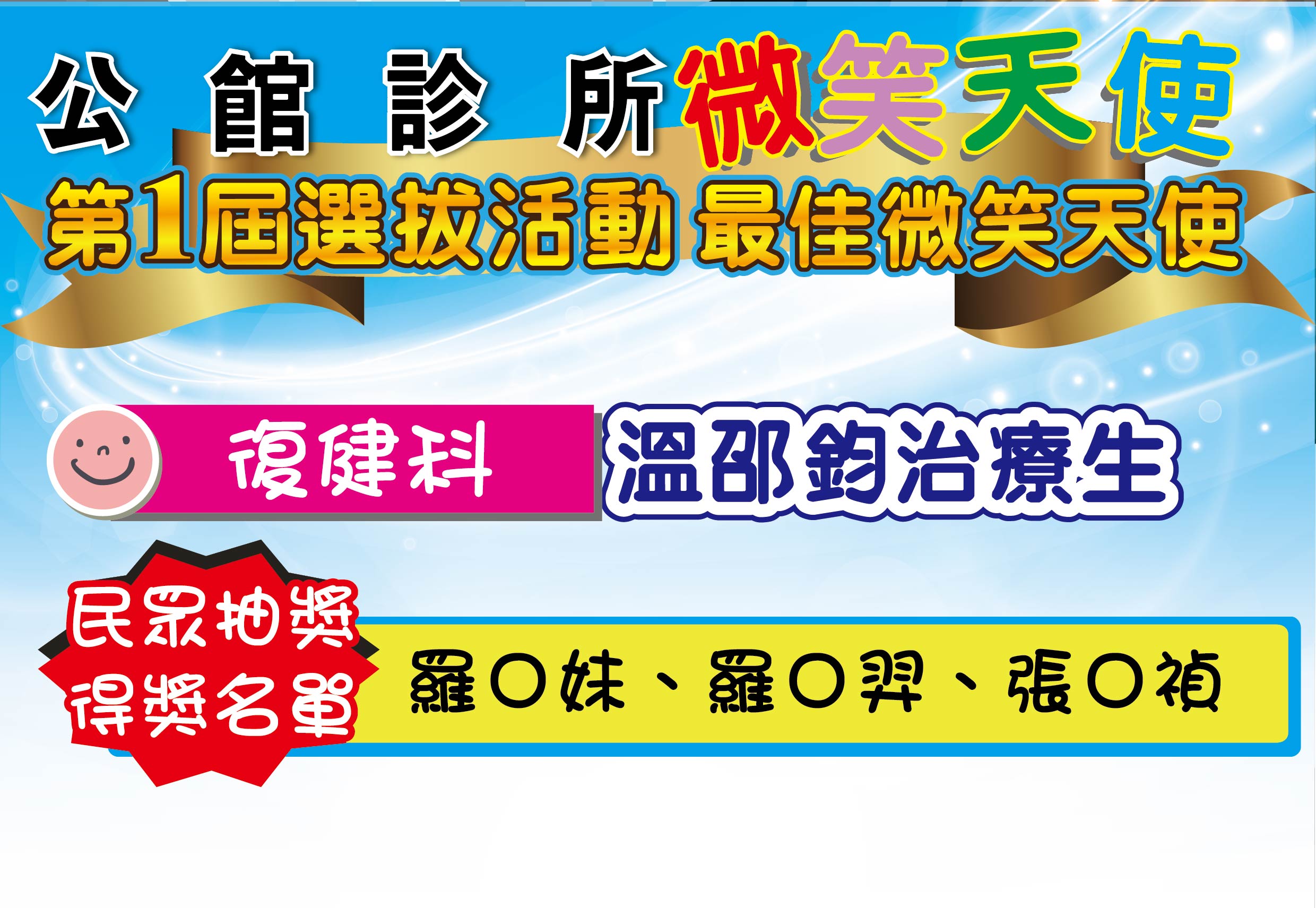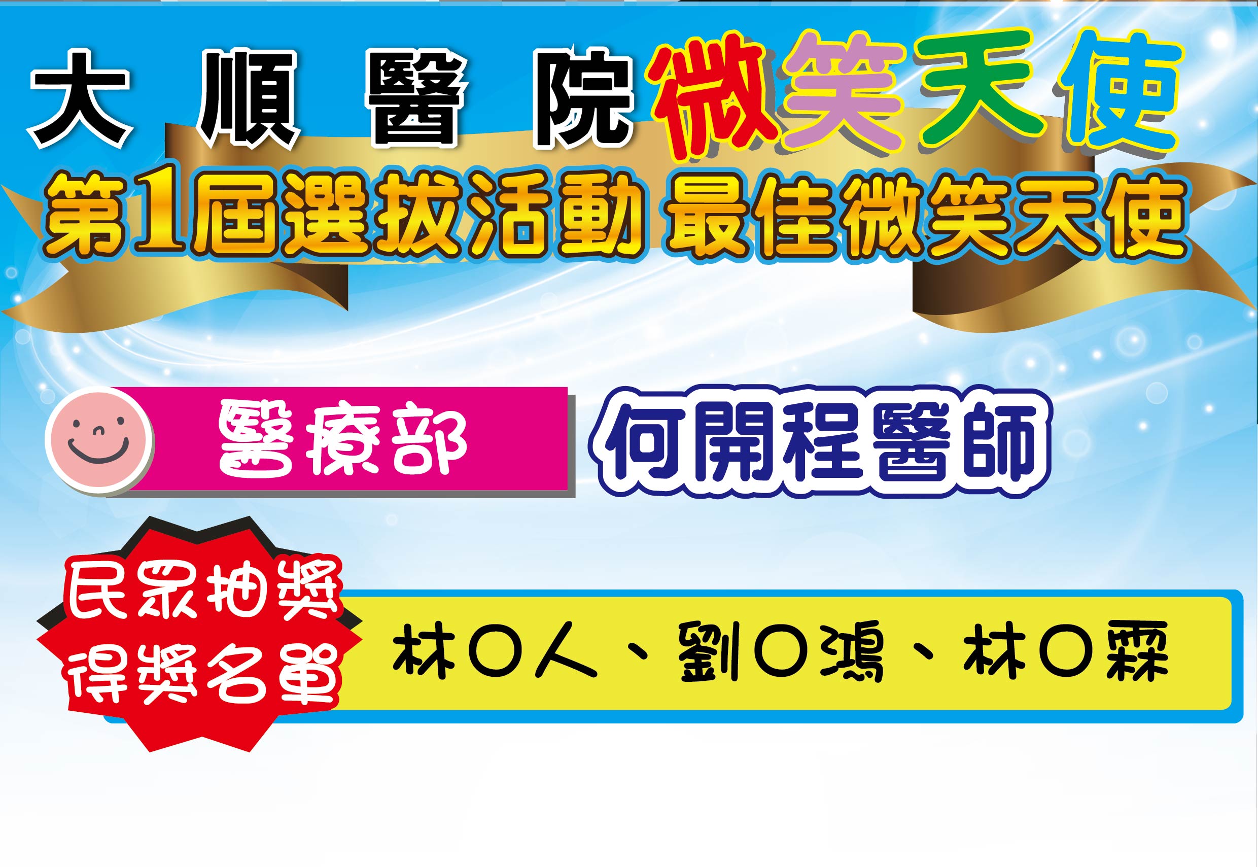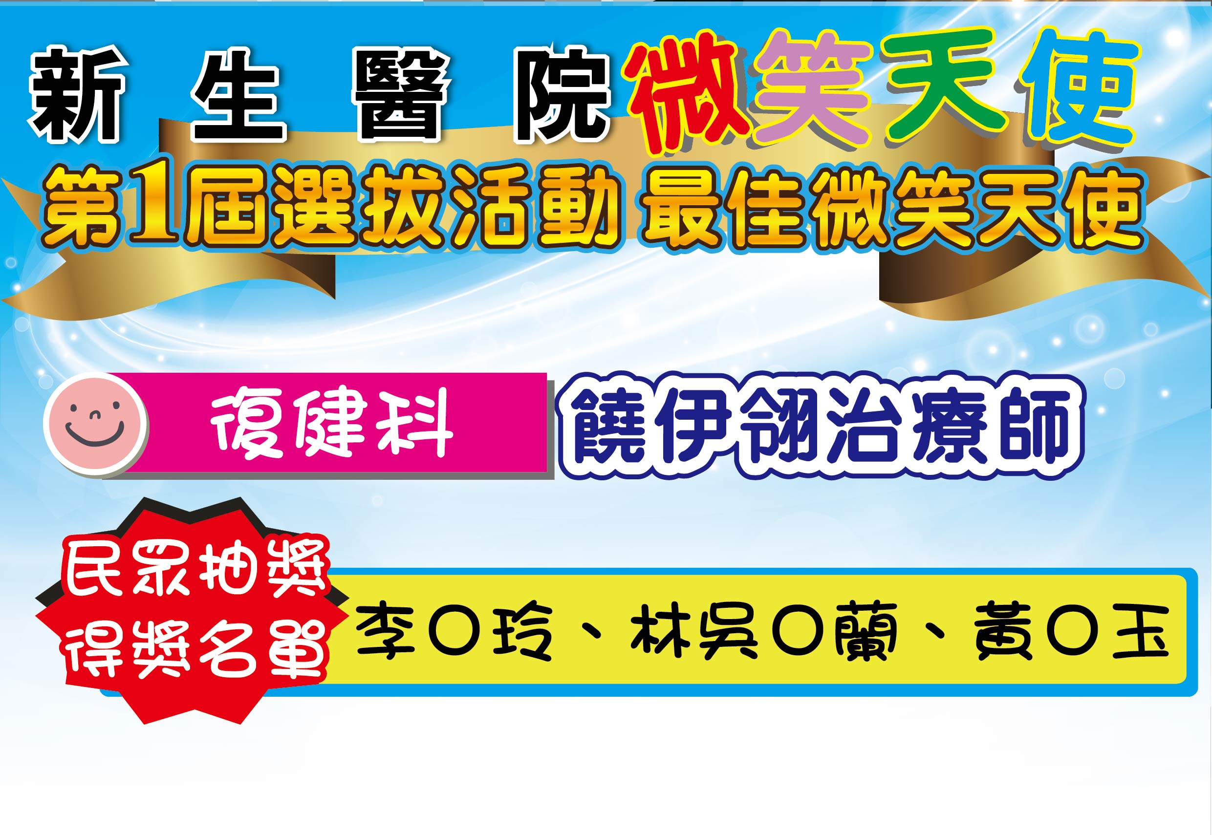 感謝活動期間給予我們支持、鼓勵的民眾 恭喜所有被選拔的微笑天使及幸運獲獎的民眾。