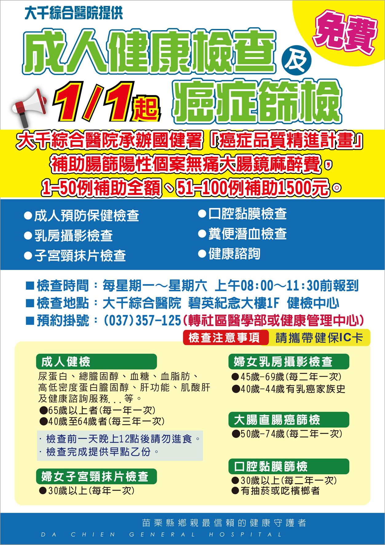 自1/1起,本院提供成人健檢及癌症篩檢,還有補助腸篩陽性個案無痛大腸鏡檢查唷~