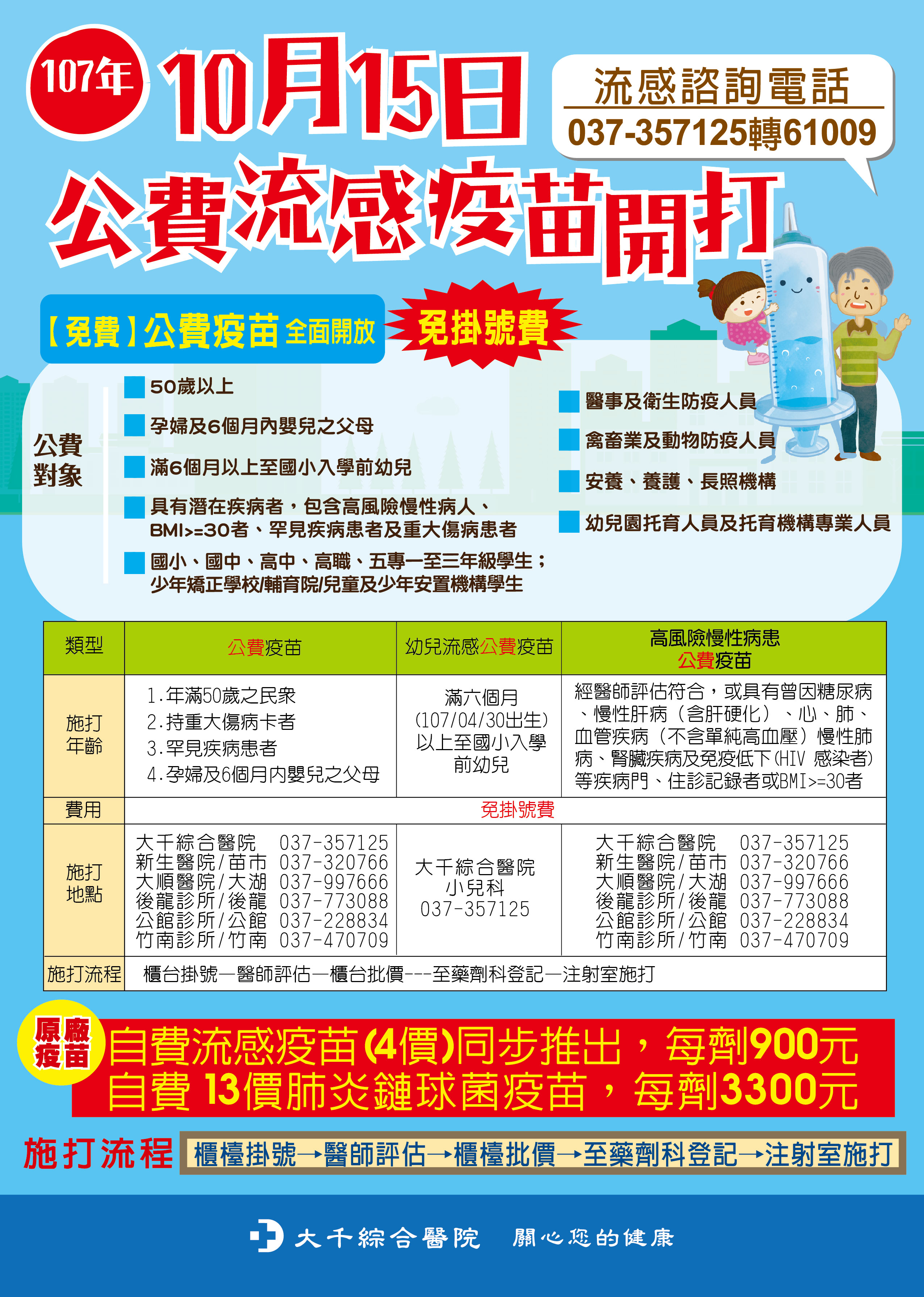 【107年10月15日 公費流感疫苗開打】 ◎諮詢電話:037-357125轉61009