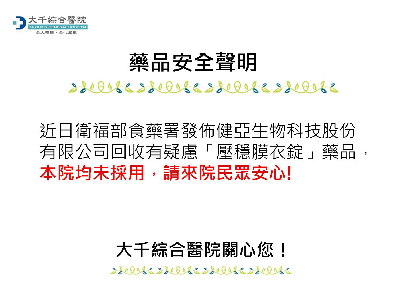 【藥品安全聲明】近日衛福部食藥署發佈健亞生物科技股份 有限公司回收有疑慮「壓穩膜衣錠」藥品, 本院均未採用,請來院民眾安心!