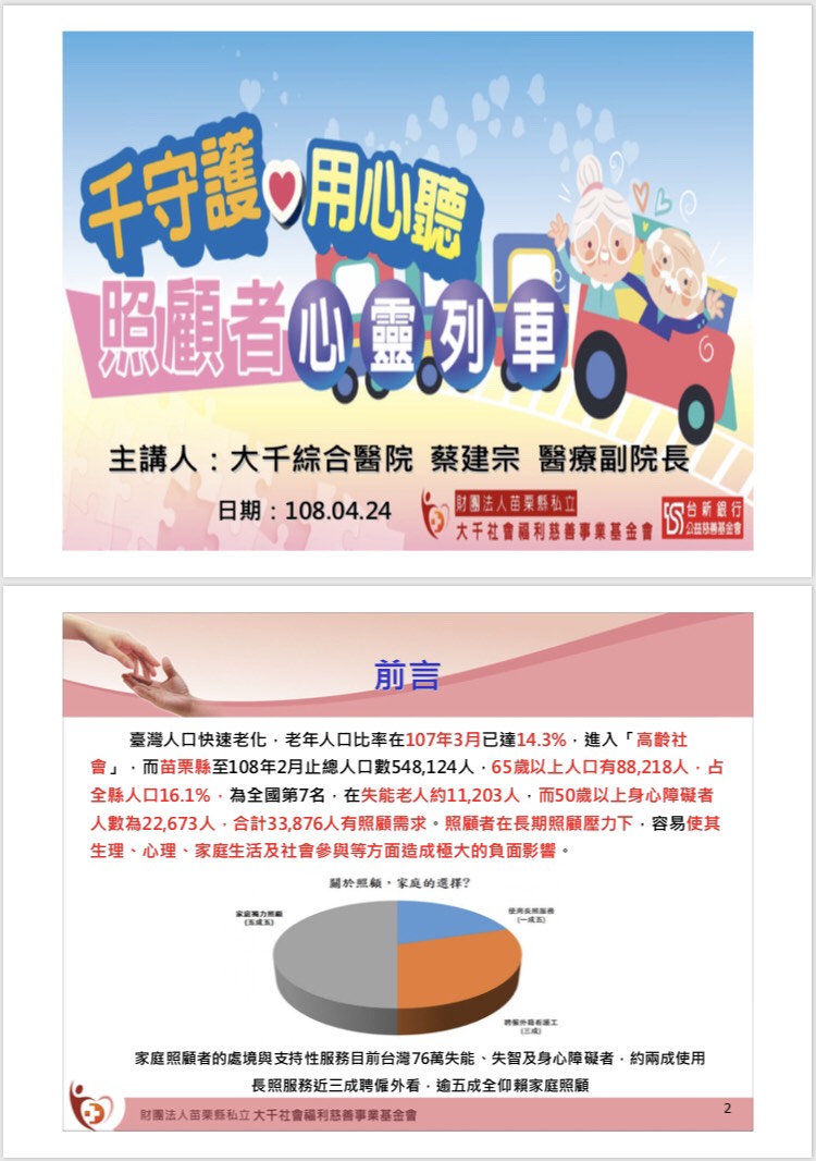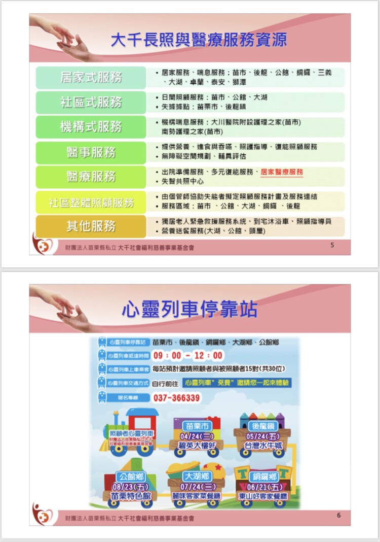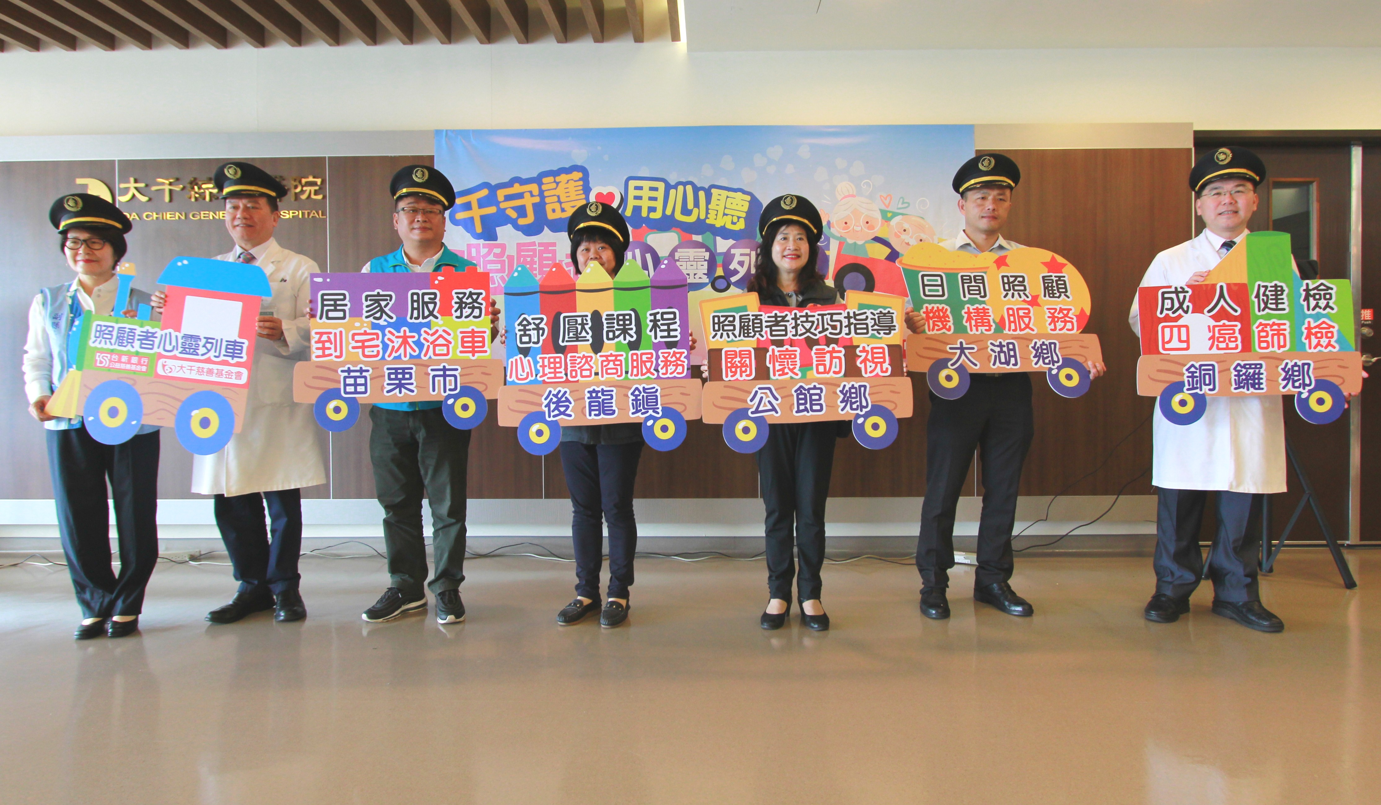 大千慈善事業基金會長期關懷苗栗縣弱勢族群和老人照護,近年因人口老化趨勢,開始提供居家服務、日間照顧和到宅沐浴車等服務,在提供服務的過程中,發現許多家庭照顧者長期承受心理和身體的壓力,因此在去年以「千守護 用心聽 照顧者心靈列車」為主題,參加台新銀行第九屆「您的一票,決定愛的力量」票選活動,經民眾熱烈參與投票,順利獲選且獲得10萬元補助金額,並於今天(4/24)在大千綜合醫院展開心靈列車的首航,接下來心靈列車活動也將會開向苗栗縣其他鄉鎮,為更多家庭照顧者服務。