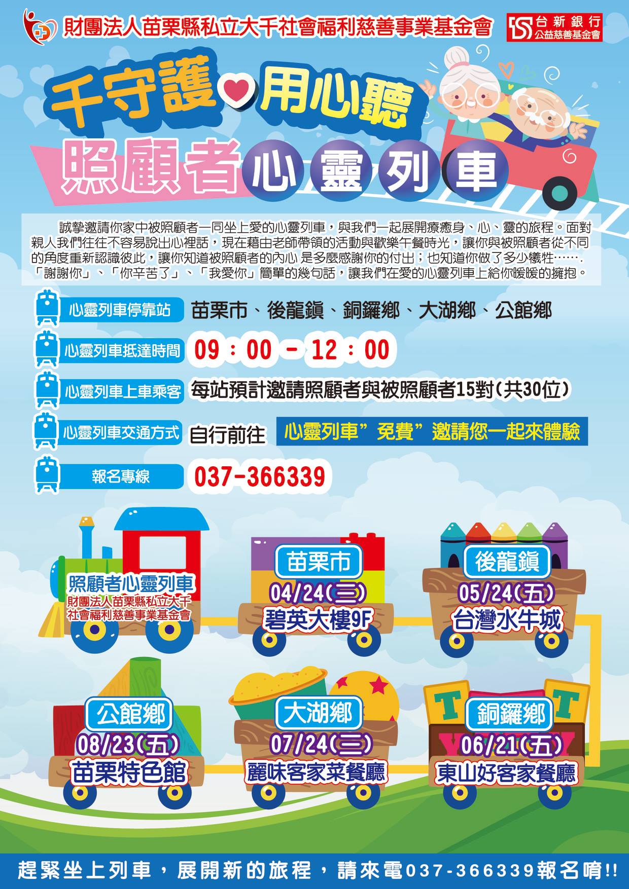 活動也將陸續前往後龍鎮(5/24)、銅鑼鄉(6/21)、大湖鄉(7/24)及公館鄉(8/23)舉行,詳細活動內容歡迎洽諮詢電話:037-366339。