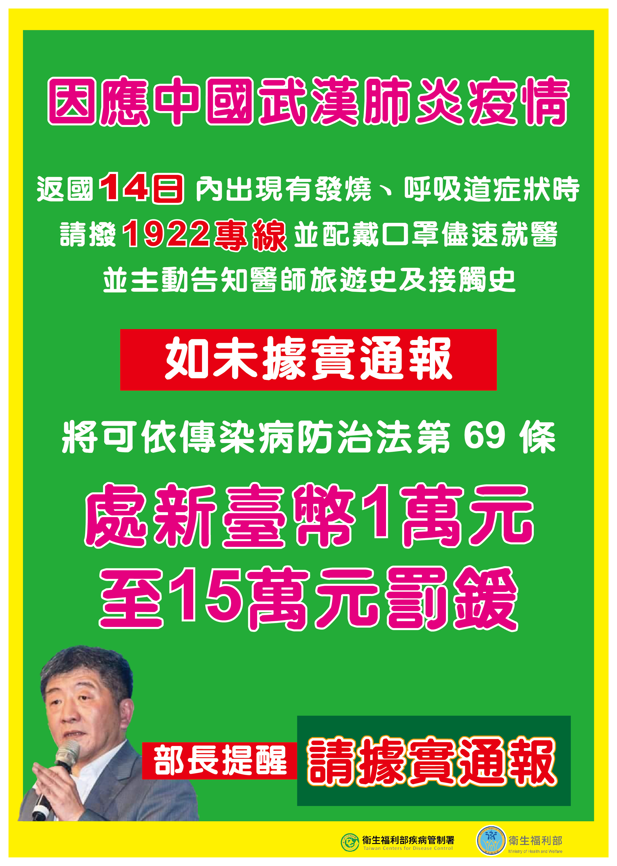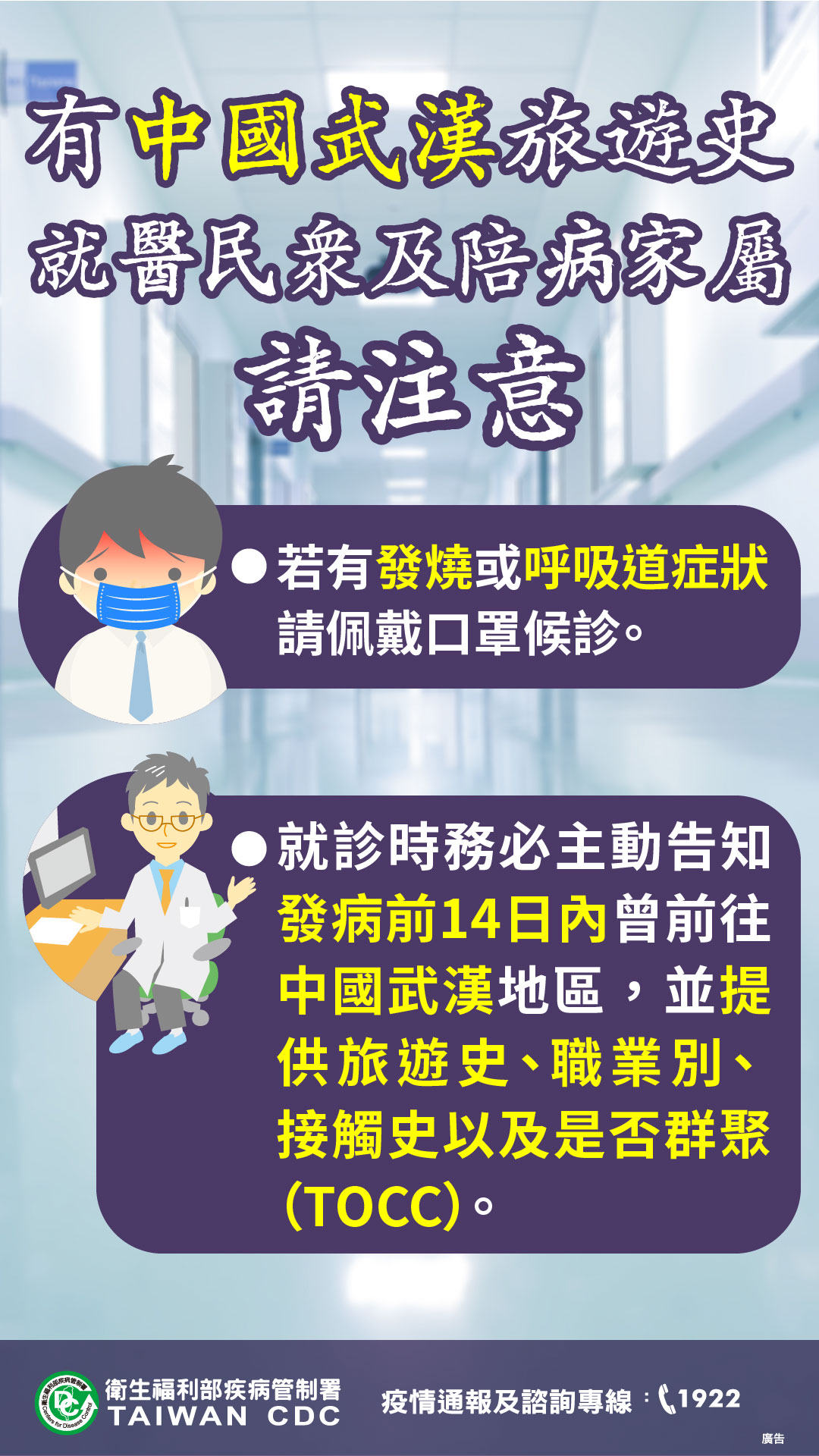 有中國武漢旅遊史,就醫民眾及陪病家屬請注意!!! 疫情通報及諮詢專線 : 1922