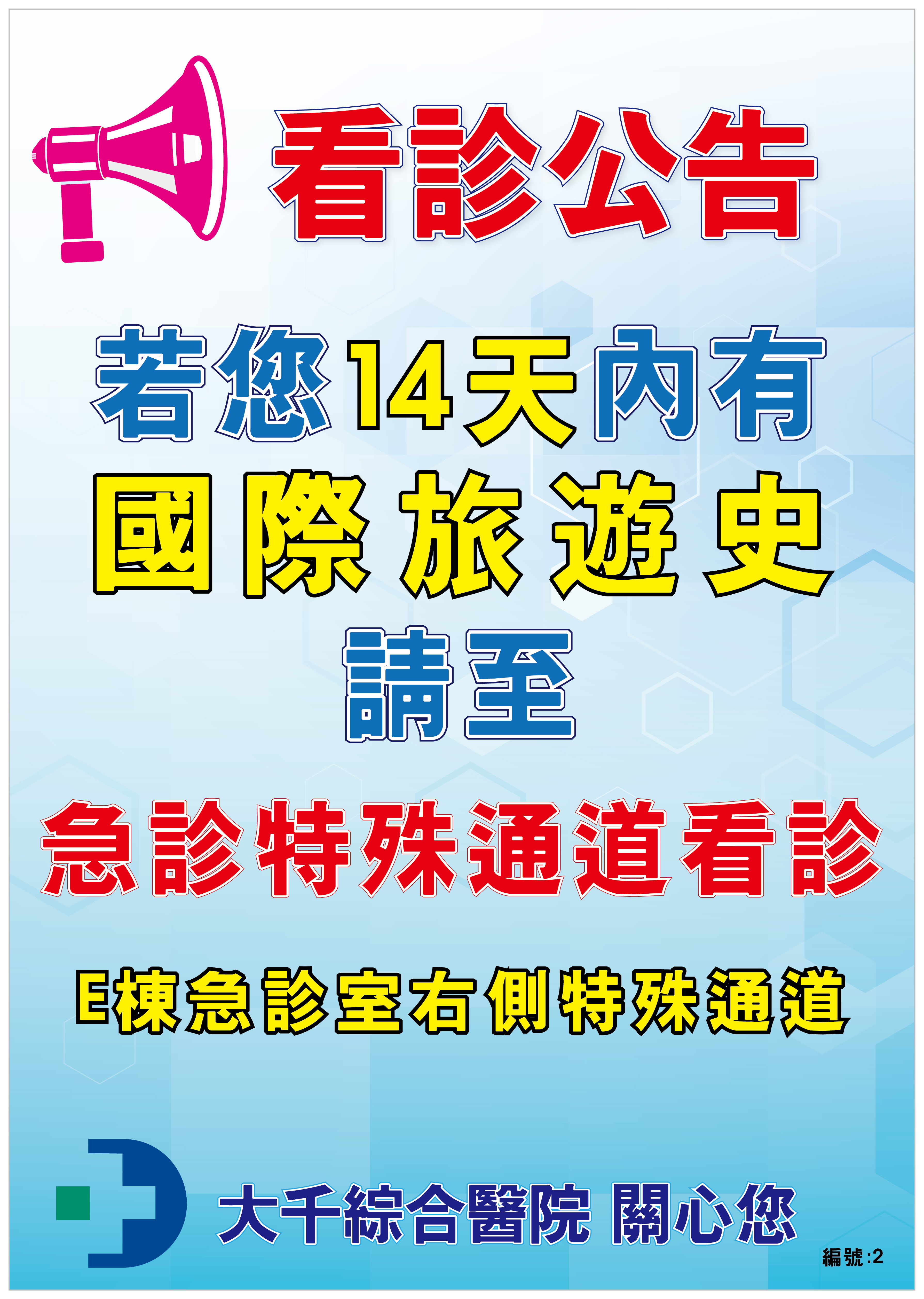 【看診公告】若您14天內有國際旅遊史,請至急診特殊通道看診(E棟急診室右側特殊通道)