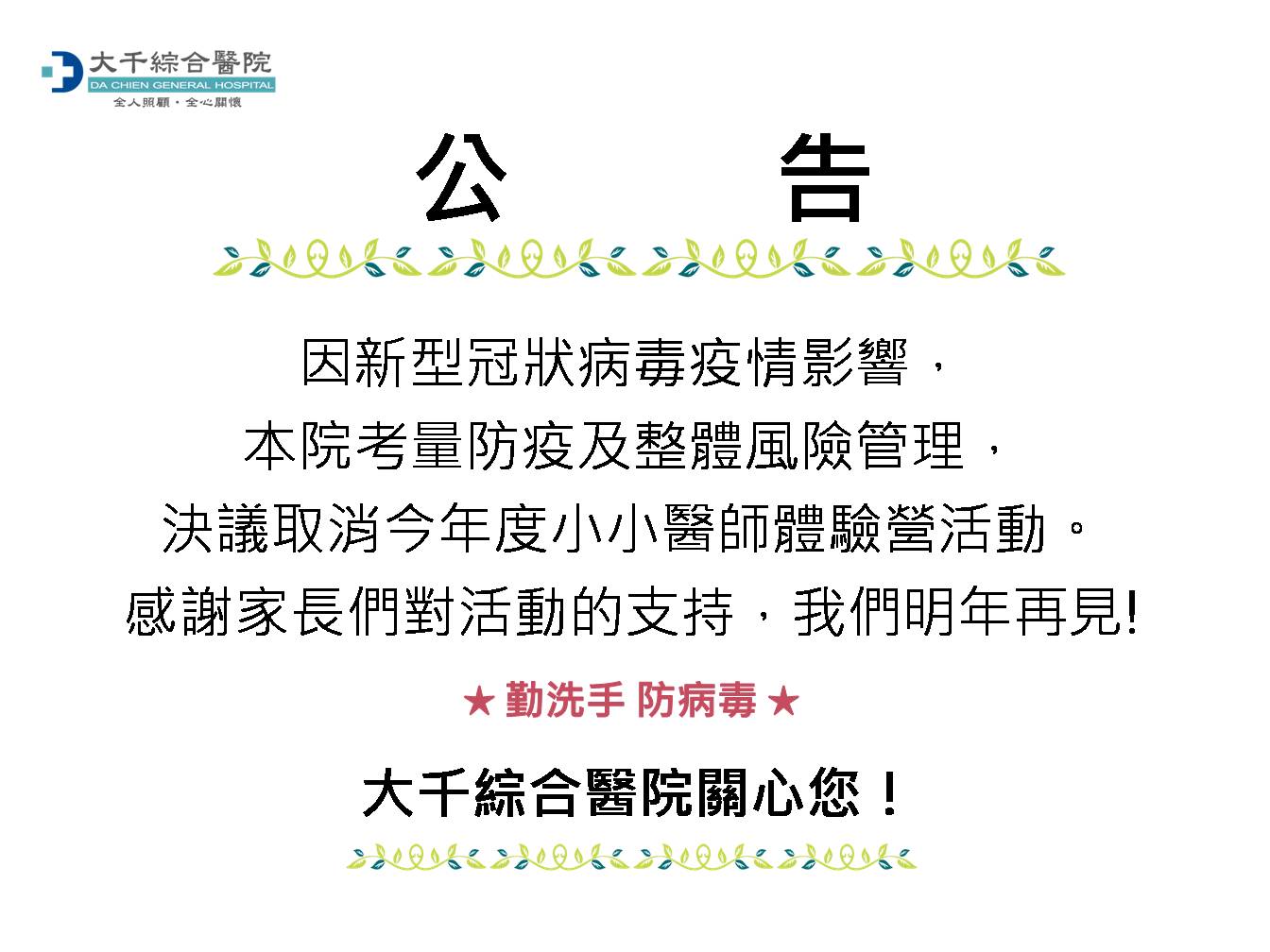 因考量防疫及整體風險管理,決議取消109年度小小醫師體驗營活動。感謝家長們對活動的支持,我們明年再見!