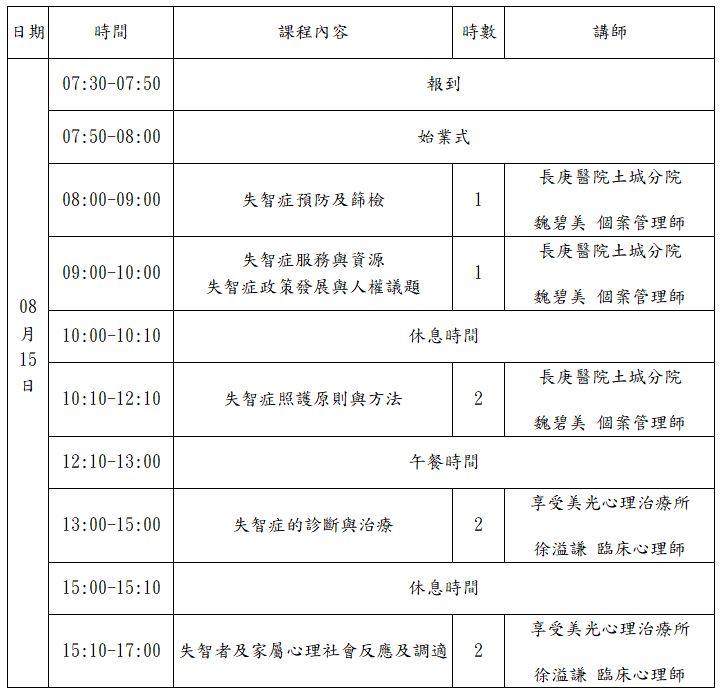 一、課程說明:為了使失智症專業人員能理解失智症的相關概念與內涵,並增加對失智症的認識與警覺,以因應未來失智者、照顧者或社會整合全人照護的需求。