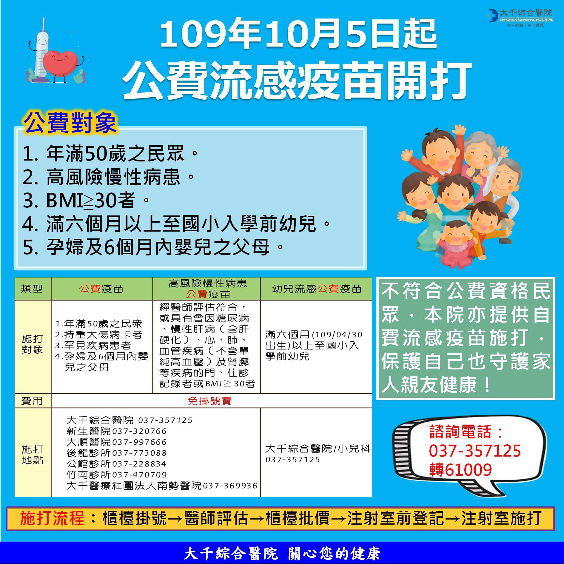 109年10月05日 公費流感疫苗開打啦 ☎諮詢電話:037-357125轉61009