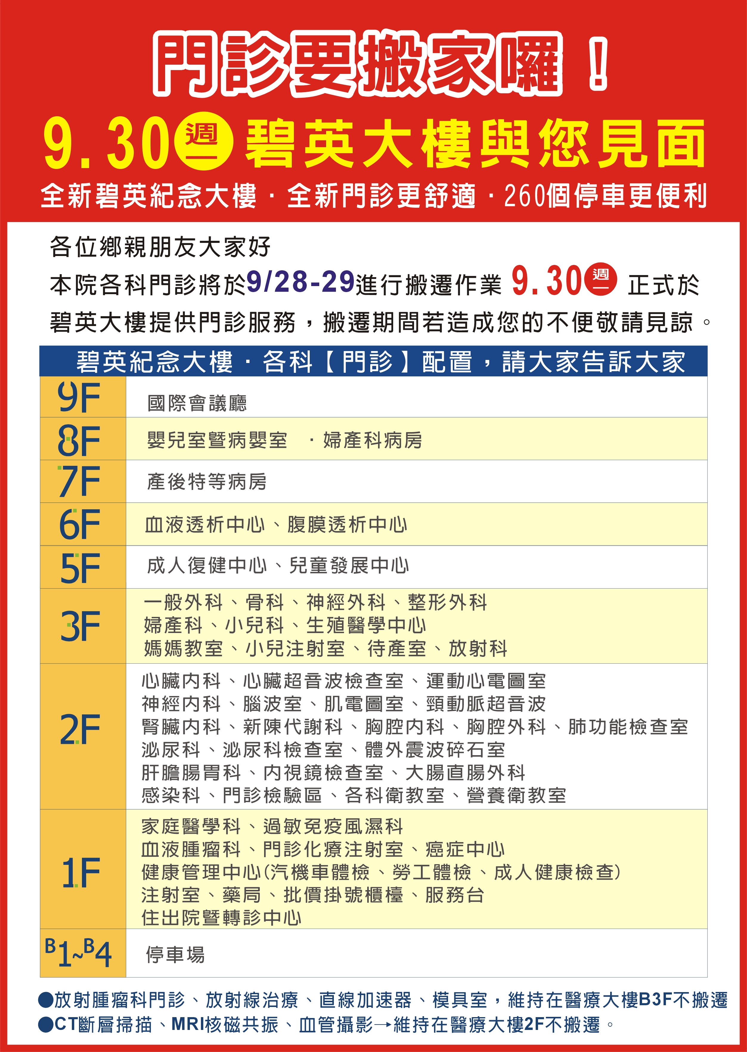 門診搬家囉! 9/30起~ 碧英紀念大樓與您見面!!