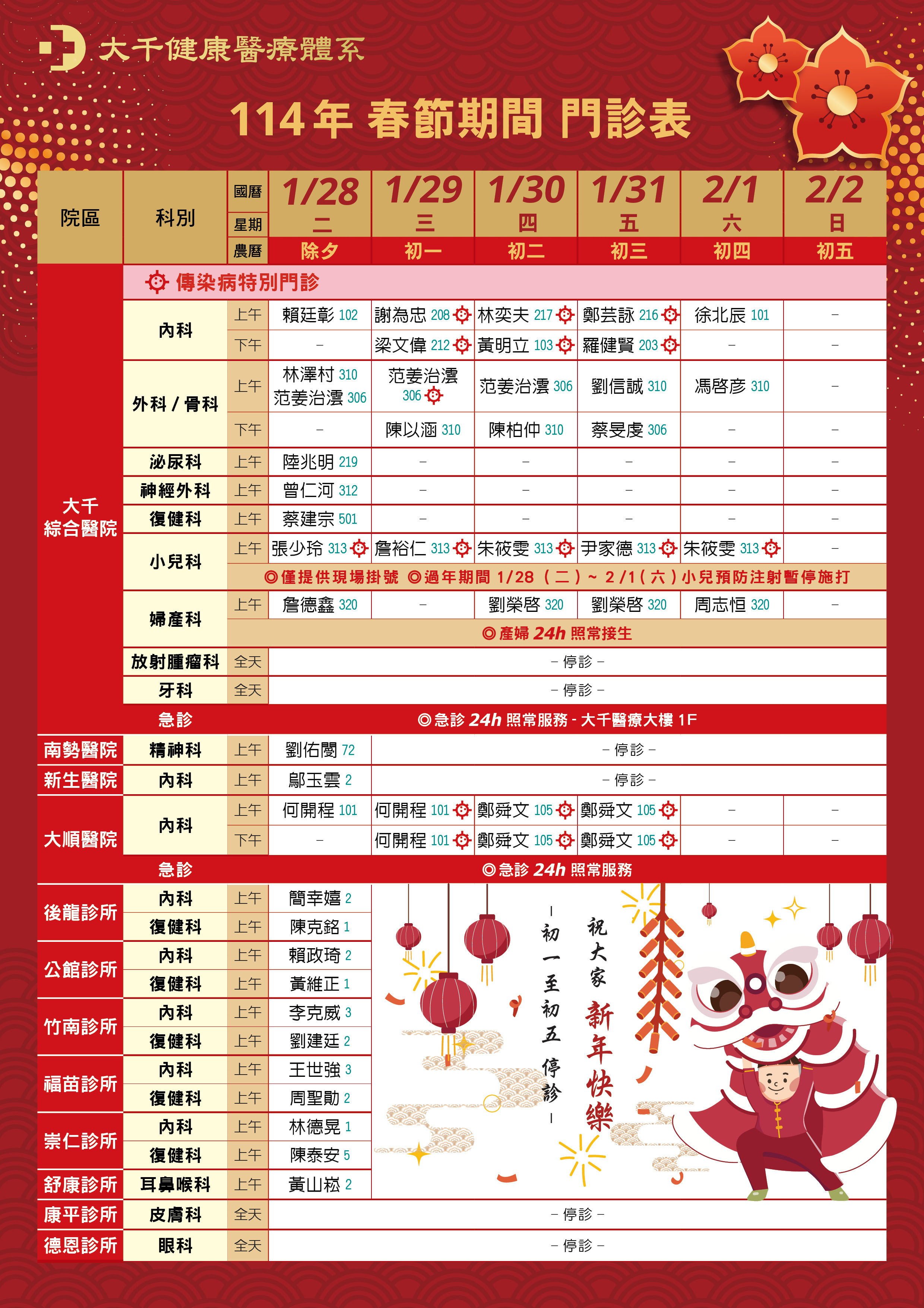 114年春節期間門診表
