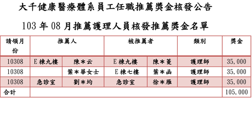 {公告}103年08月推薦護理人員核發推薦獎金名單