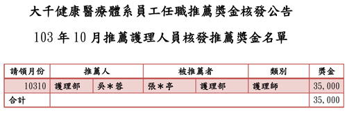 {公告}103年10月推薦護理人員核發推薦獎金名單