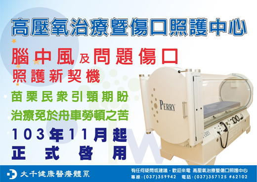 苗栗鄉親引頸期盼,腦中風及問題傷口照護新契機,治療免於舟車勞頓之苦 本院自103年11起,開始提供苗栗唯一高壓氧治療服務