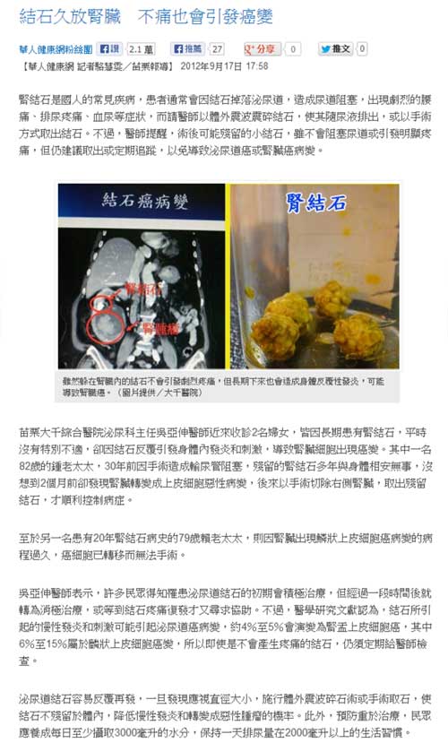 華人健康網:結石久放腎臟 不痛也會引發癌變(泌尿科吳亞伸)
