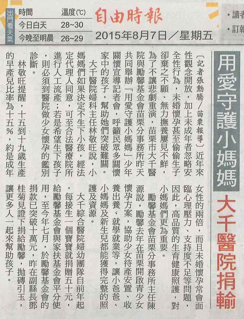 104.08.07自由:用愛守護小媽媽大千醫院捐輸