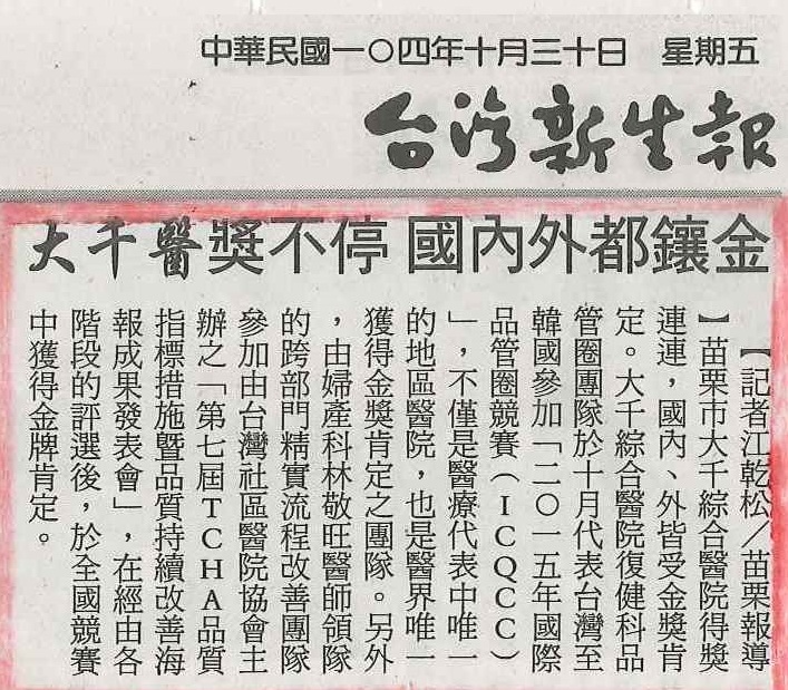 104.10.30台灣新生報:大千醫獎不停國內外都鑲金