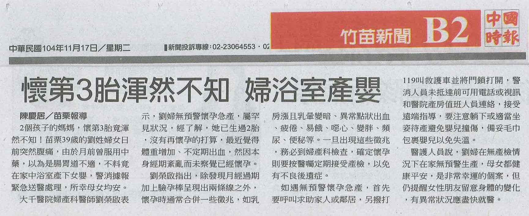 104.11.17中時:懷第3胎渾然不知婦浴室產嬰
