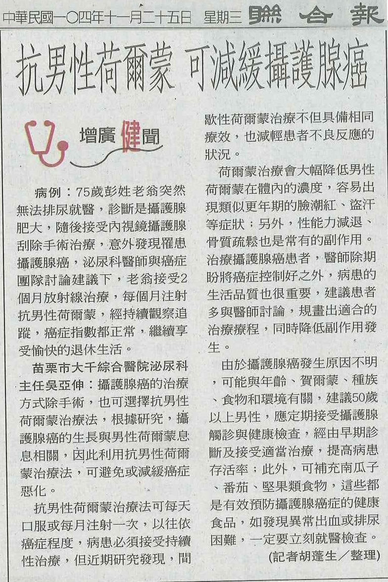 104.11.25聯合:抗男性賀爾蒙可減緩攝護腺癌