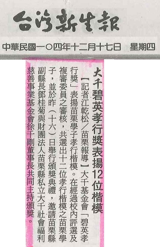 104.12.17台灣新生報:大千碧英孝行獎表揚12位楷模
