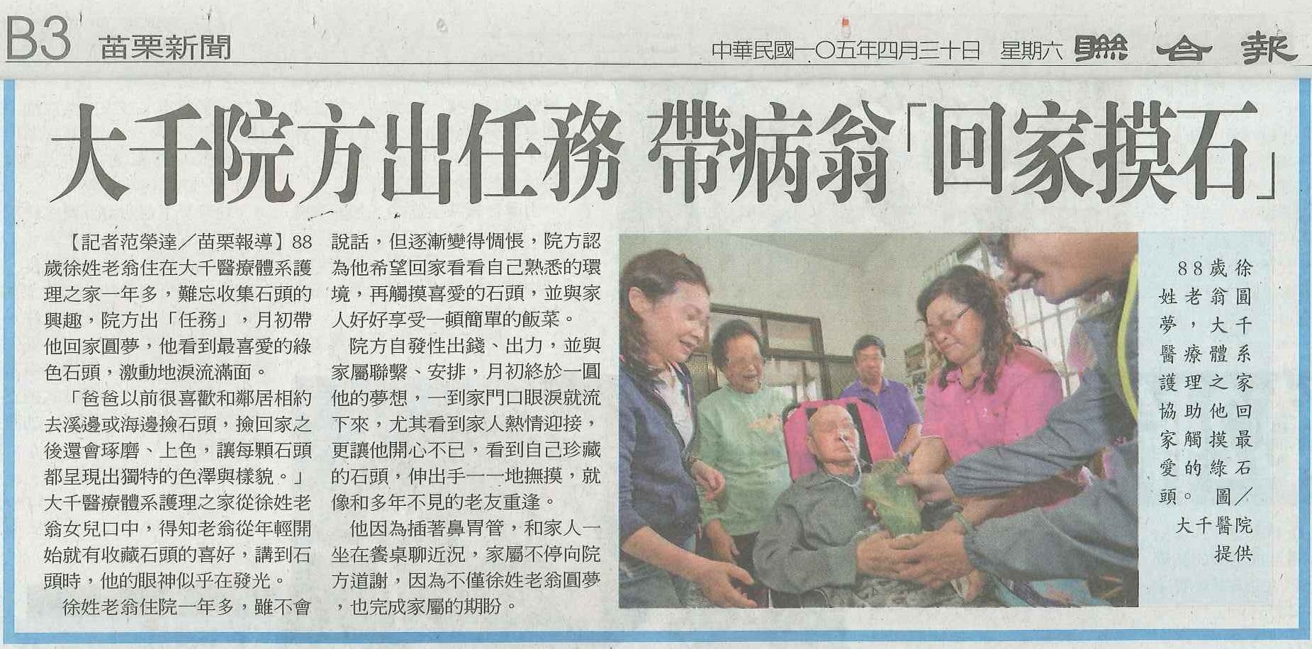 105.04.30聯合:大千院方出任務帶病翁回家摸石