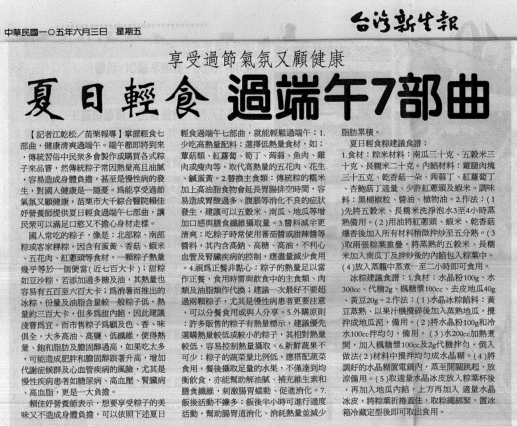 105.06.03台灣新生報:夏日輕食過端午7部曲