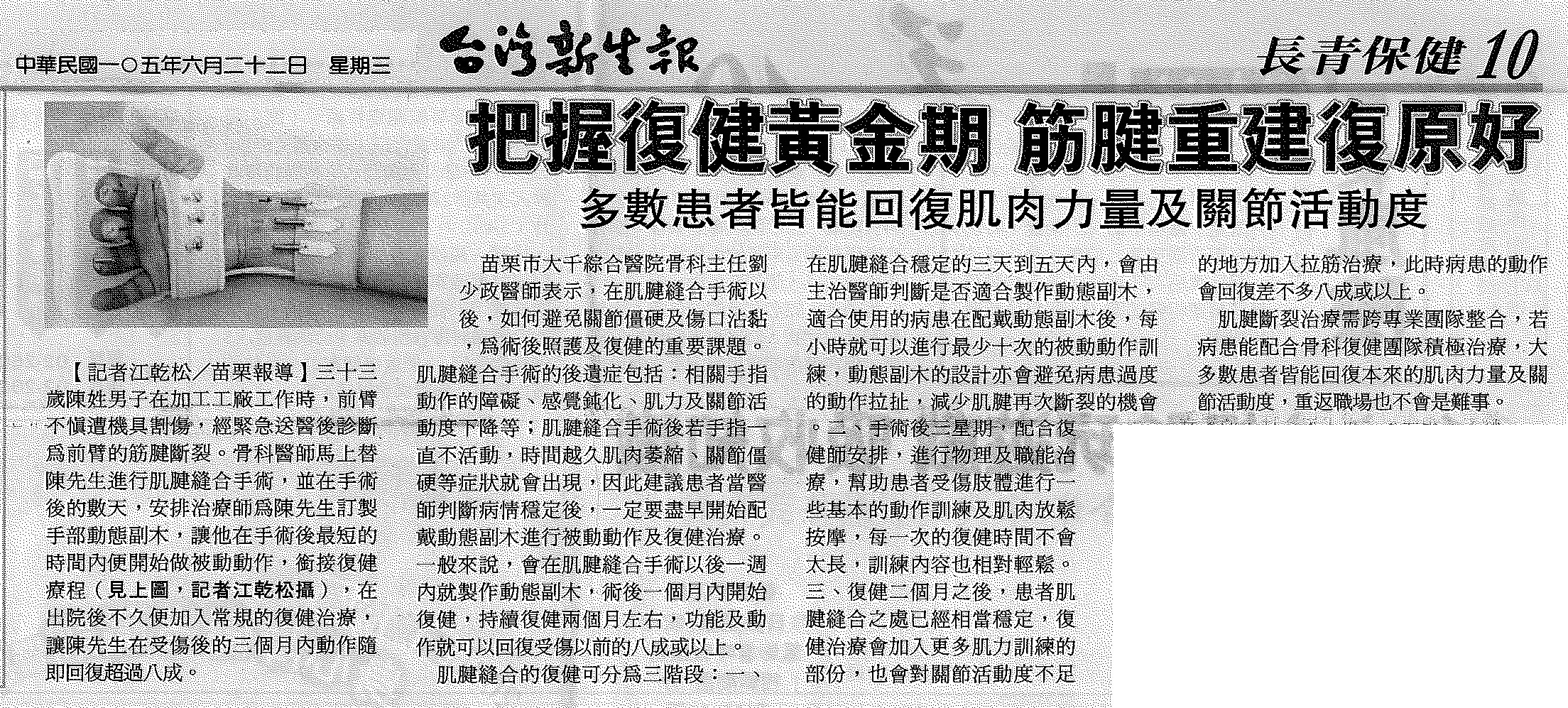 105.06.22台灣新生報:把握復健黃金期筋腱重建復原好