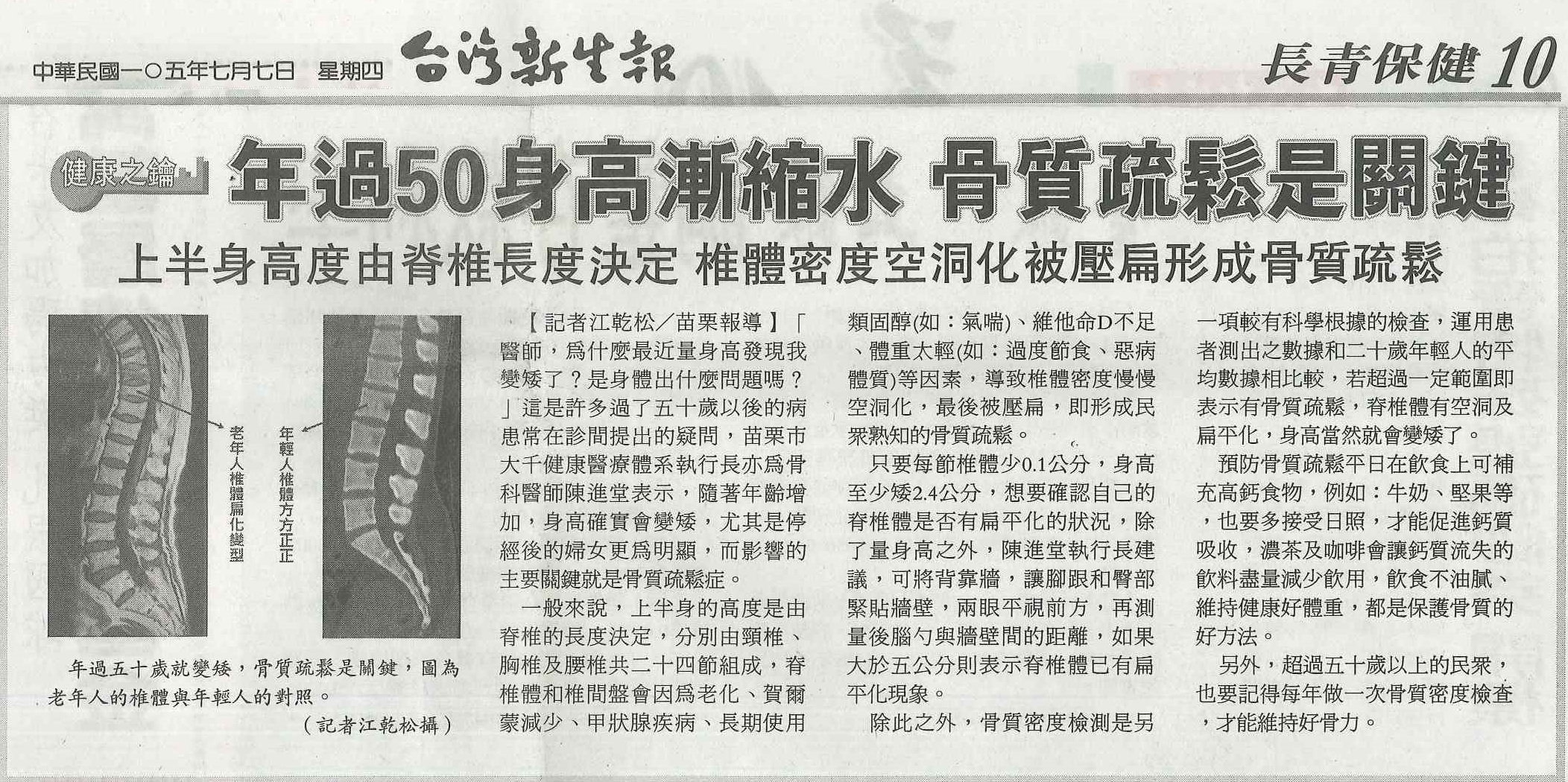 105.07.07台灣新生報:年過50身高漸縮水骨質疏鬆是關鍵