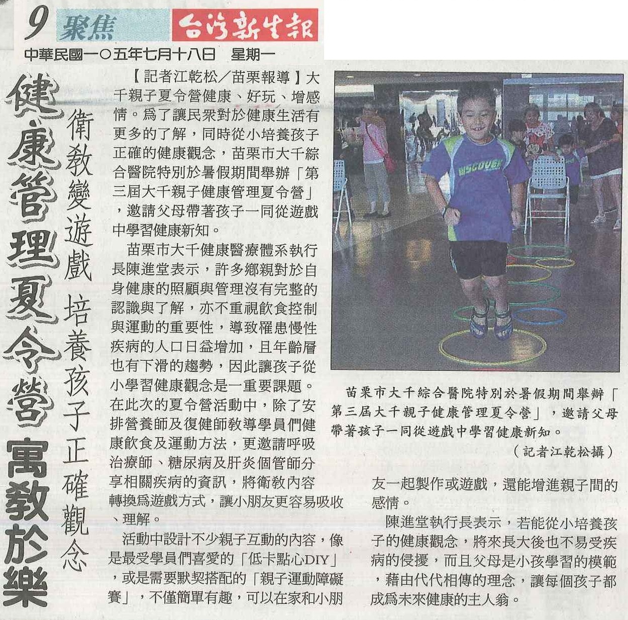 105.07.18台灣新生報:健康管理夏令營寓教於樂