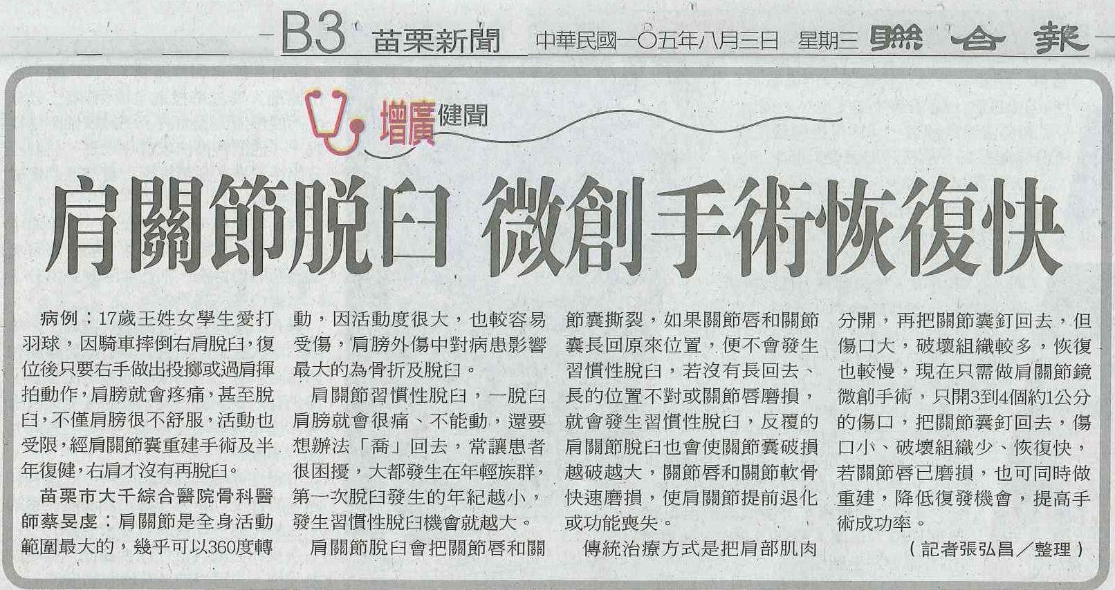 105.08.03聯合:肩關節脫臼微創手術恢復快