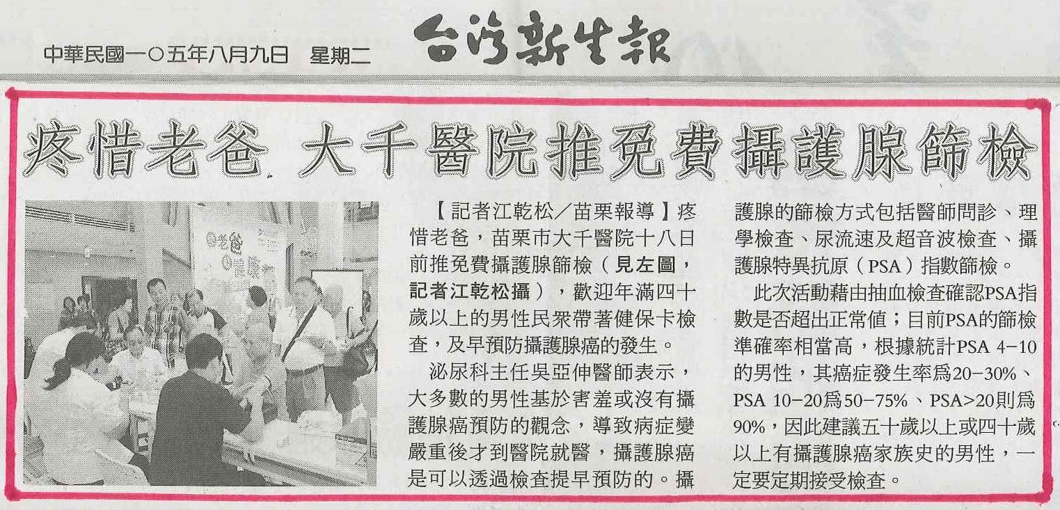 105.08.09台灣新生報:疼惜老爸大千醫院推免費攝護腺篩檢