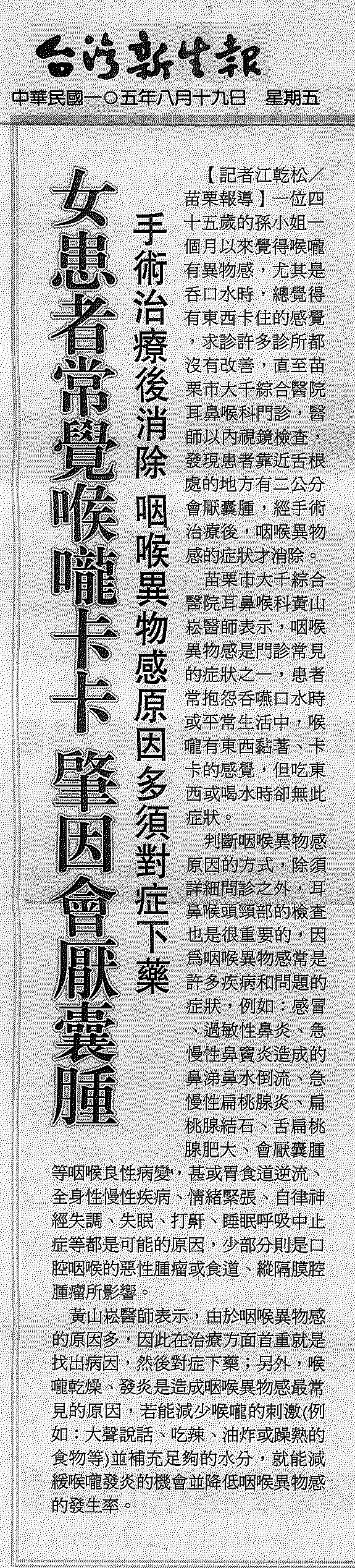 105.08.19台灣新生報:女患者常覺得喉嚨卡卡肇因會厭囊腫